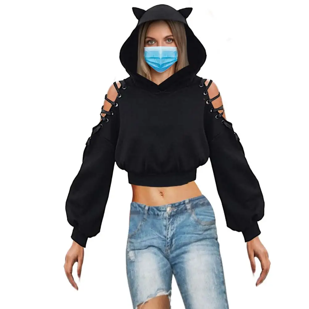 Женская толстовка с капюшоном y2k, Черная Толстовка с длинным рукавом и кошачьими ушками, в стиле Харадзюку, в готическом стиле, топы на завязках