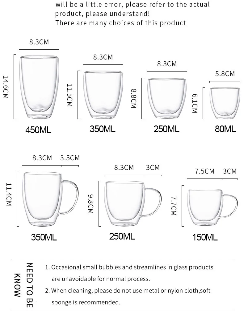 Название продукта: Двухслойное стекло с ручкойЦвет: прозрачныйСпецификация: 150 мл 250 мл 350 млРазмеры: 7,5*7,7/8,3*9,8/8,3*11,4Материал: высокое боросиликатное стеклоВес: 200 г 250 г 300 гПрименение: чашка для воды, чашка для кофе, чашка для молокаОсобенность 1: высокое боросиликатное стекло, анти-обжигание и высокая термостойкостьОсобенность 2: Цельное формование, гладкое и нежноеОсобенность 3: круглый носок и тонкая работаОсобенность 4: ручная выдувная ручка, бесшовное соединение и легко держатьОсобенность 5: утолщенное дно чашки, стабильное размещение и длительный срок службыПримечание:1. Может быть небольшая Хроматическая аберрация из-за различных световых сигналов и разных дисплеев. При ручном измерении изделия возможна погрешность в размере, которая предназначена только для справки, и все зависит от фактического продукта.