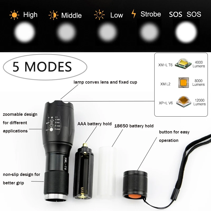 О светодиодный фонарик:Этот высококачественный водостойкий 4000LM/6000LM/8000LM светодиодный фонарик/фонарь с диммером, регулируя телескопическую головку; Кнопка всегда работает в режиме переключения, И вы можете быстро переключаться с помощью полунажатия кнопки.