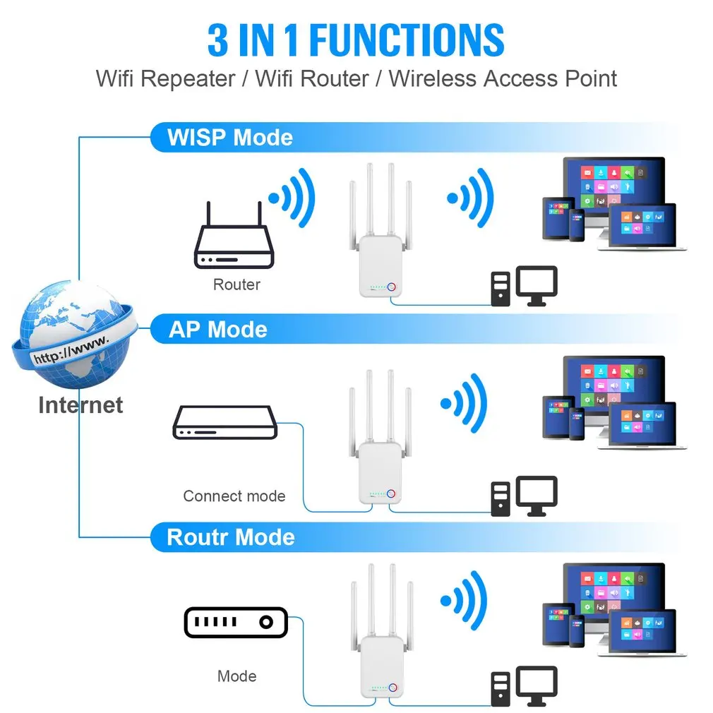 Беспроводной ретранслятор Wi-Fi, 300 Мбитс, 1200 Мбитс, одночастотный, 2,4, 5G, 4 антенны, расширитель диапазона сигнала, для домашней сети