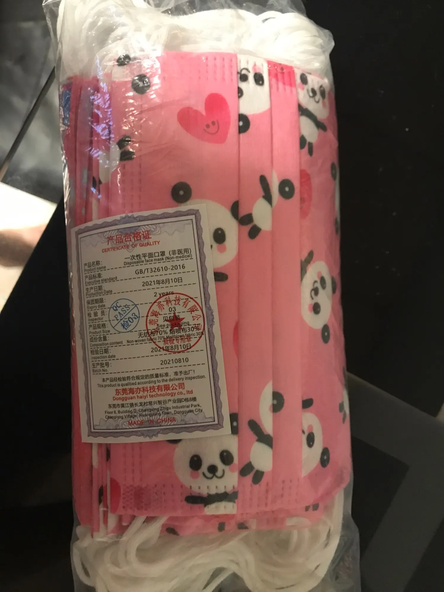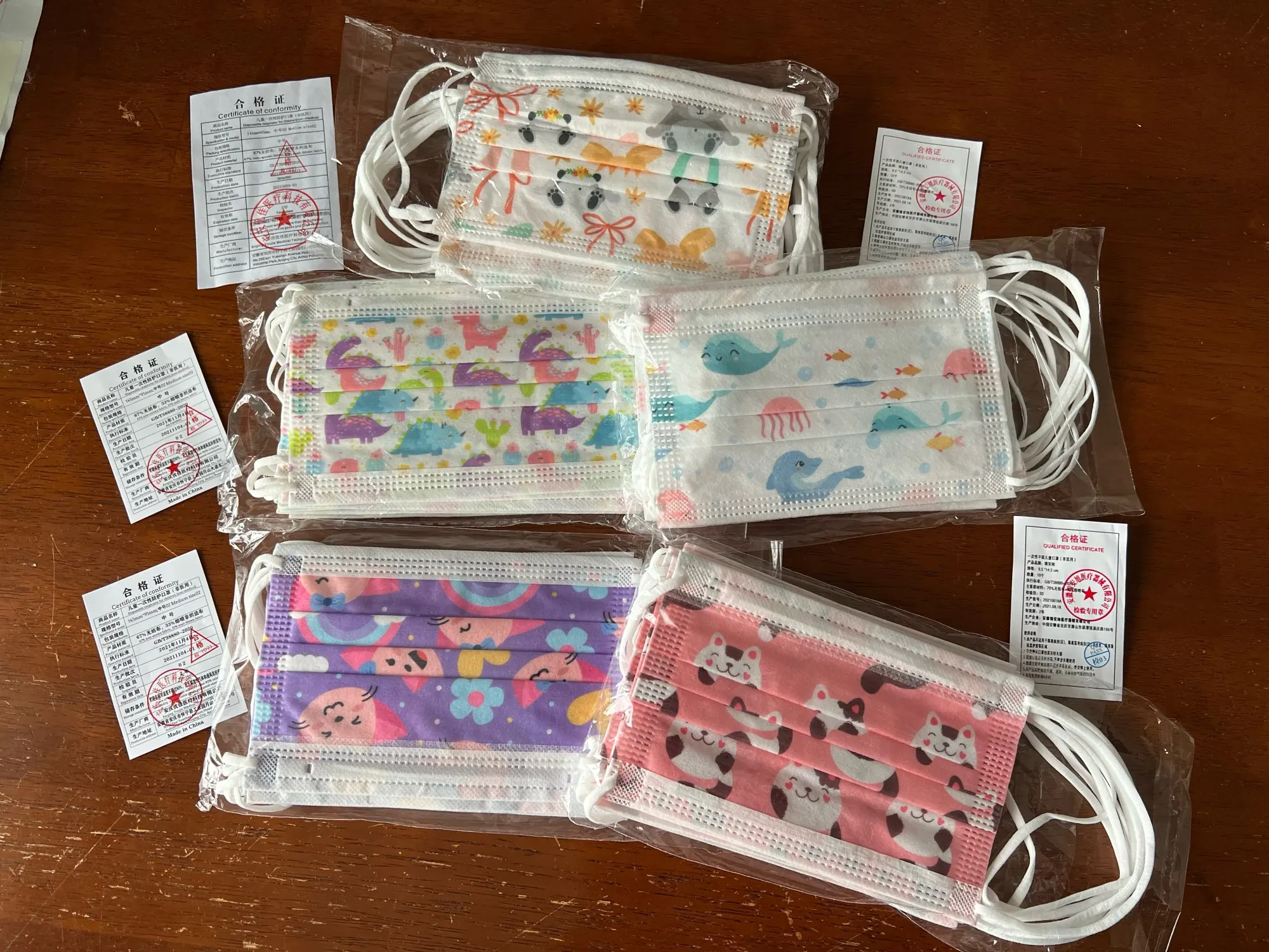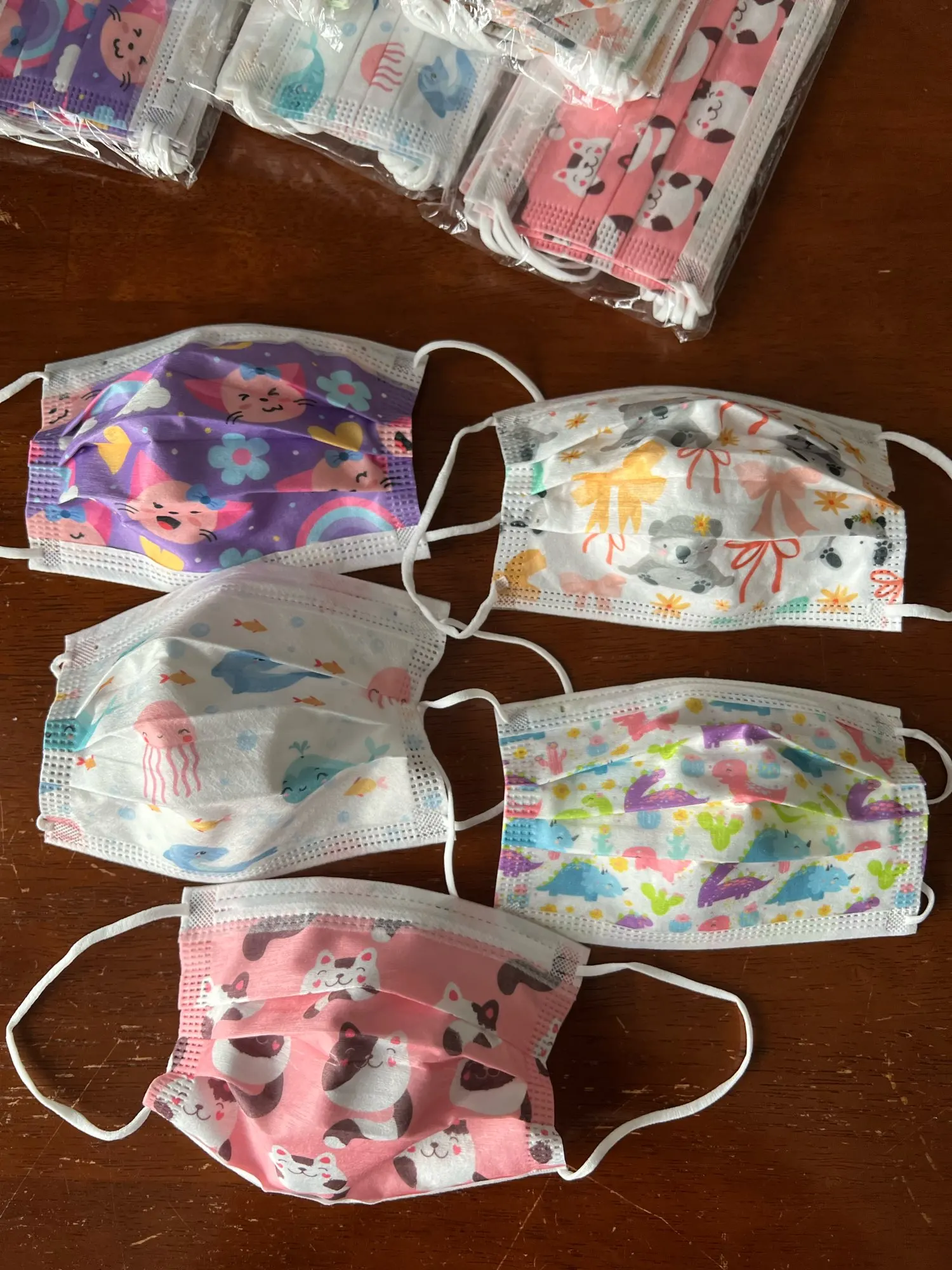 На удивление хорошие маски! Сделаны качественно. Подойдут детям 5-12 лет отлично. Моей 8-летней дочке хорошо, 4-летней - велики немного. Дышать через них легко, они достаточно тонкие. Принты нежны, красивые. Запаха нет, хотя есть совсем легкий приятный пудровый аромат. Все шнурочки прикреплены надёжно и ровно. Упакованы по 10 масок в отдельный пакетик. В каждом пакетике был сертификат качества. Доставили достаточно быстро: около двух недель.
