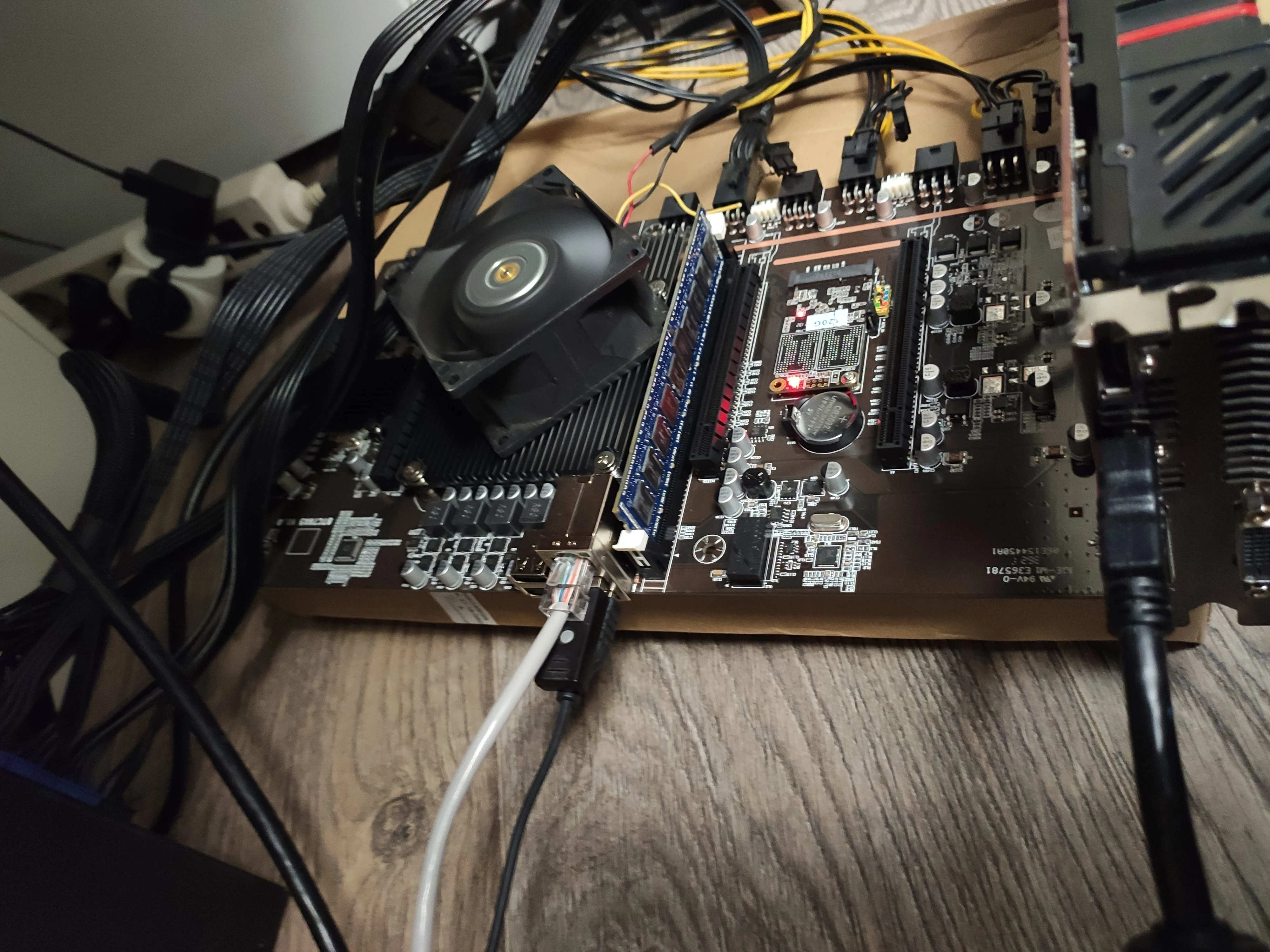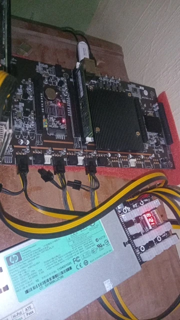 Отличная материнская плата для 5 видеокарт без рейзеров. Процессор 2620 уже установлен, охлаждается простым радиатором. Греется довольно сильно. Надо будет установить вентилятор, но не нашел ни одного разъема 3pin на материнской плате, их нет. Буду подключать вентилятор к желтому и черному проводу от 6pin. На плате стоит перемычка авто включения. Батарейка 2032 уже в комплекте. Сразу поставил Windows, без проблем. Так же без проблем загрузился с RaveOS.