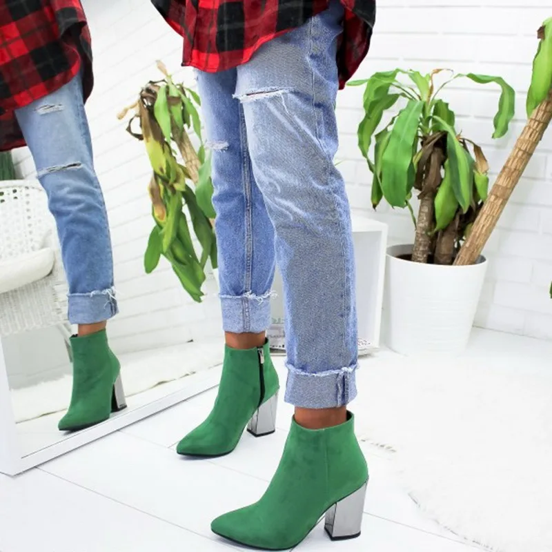 Ботильоны женские на толстом высоком каблуке, ковбойские ботинки с острым носком, кожаная обувь в западном стиле, зеленые, красные, синие, размеры 43, для осени