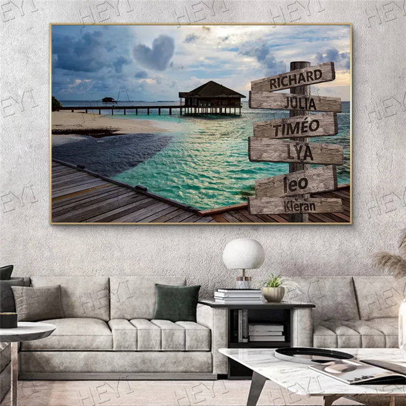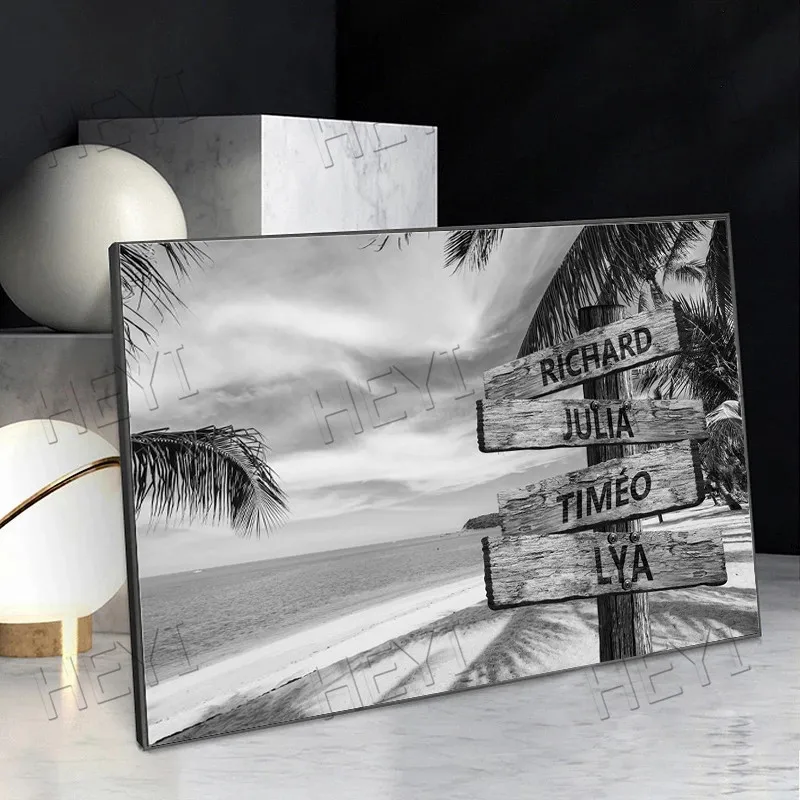 Мальдивский пляж, индивидуальный деревянный знак имени, персонализированная Настенная картина на холсте, черно-белая семья, подарки для декора гостиной