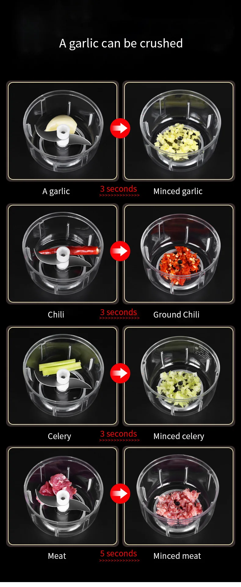 2. Прочный и прочный: лезвие из нержавеющей стали отличается прочностью и высокой эффективностью резки. Пищевой пластик в чашке не содержит BPA, может держать продукты безопасно, прочен и не содержит бактерий.