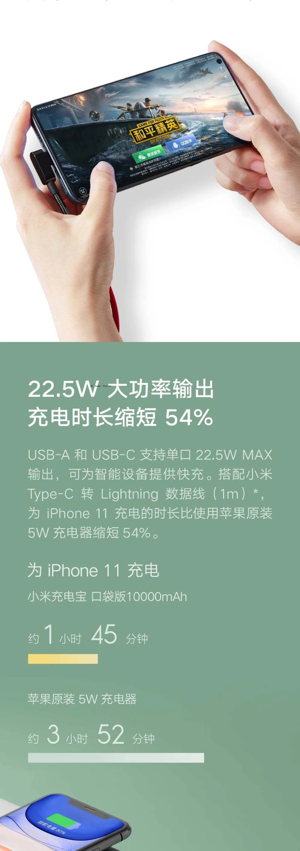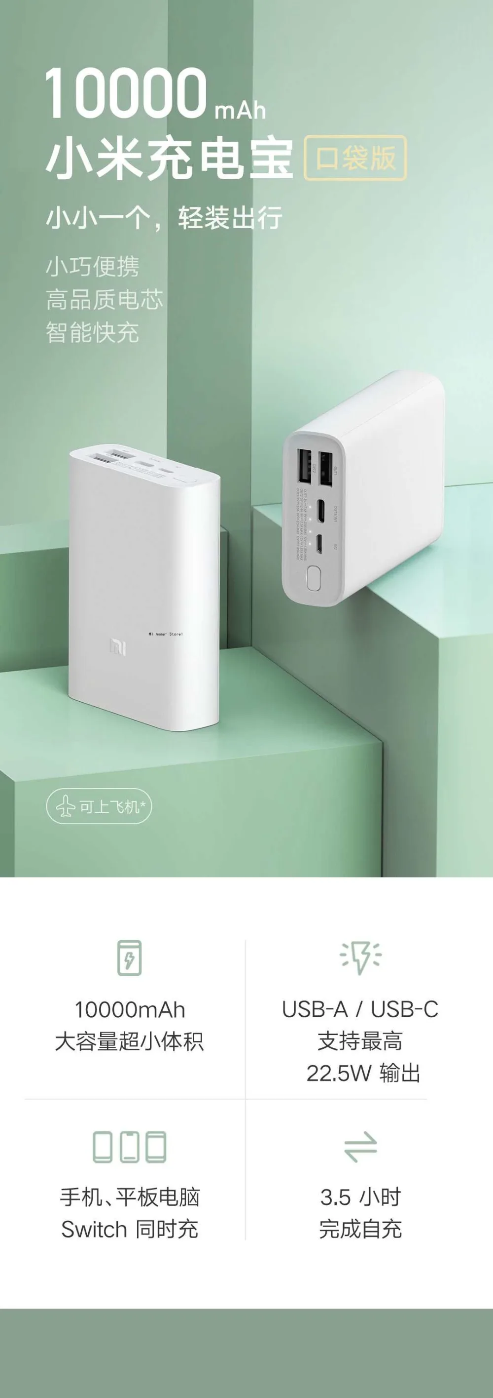 Особенность:Большая емкость 10000 мАч и сверхмалый объем, вес 200 г.Выходная мощность 22,5 Вт, время зарядки сокращается на 54%.Заряжаются одновременно три устройства, которые могут заряжать планшеты, мобильные телефоны и переключатели.В дополнение к двум выходным портам USB-A есть также интерфейс выходного порта USB-C.Три интерфейса могут выводить одновременно для зарядки 3 устройств.Большая емкость и Ультра маленький размерUSB-A/ USB-CПоддержка выходной мощности до 22,5 ВтМобильный телефон, планшетОдновременная зарядка переключателяМожно взять на борт самолета