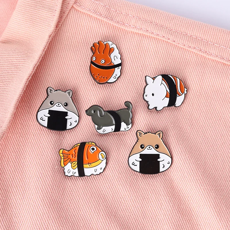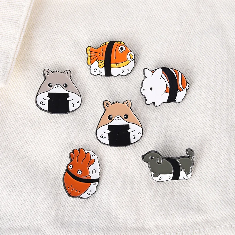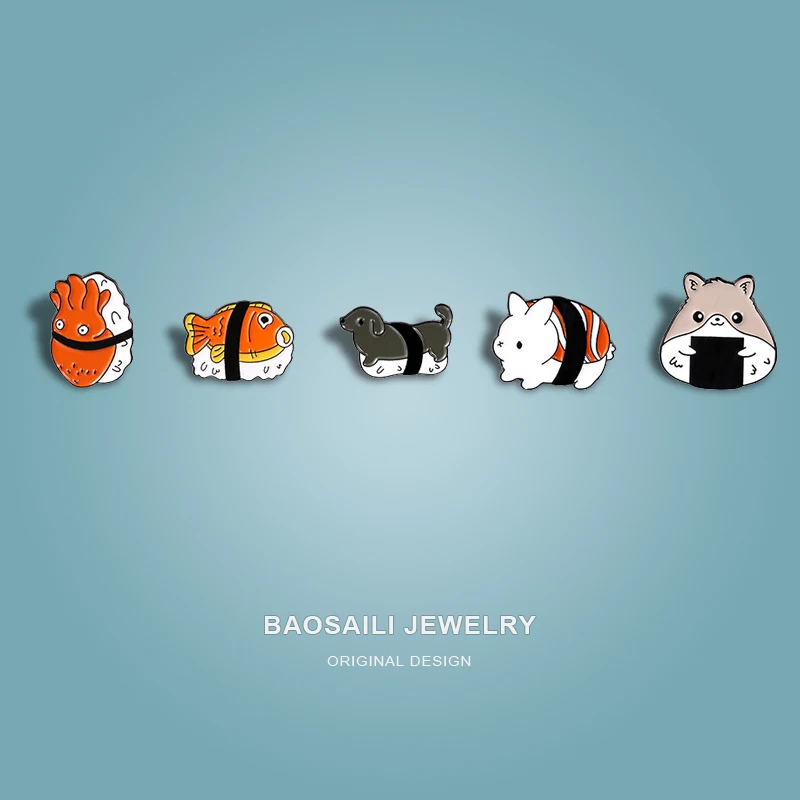 Эмалированная брошь в виде рисового шара, суши, кролика, таксы, рыб...