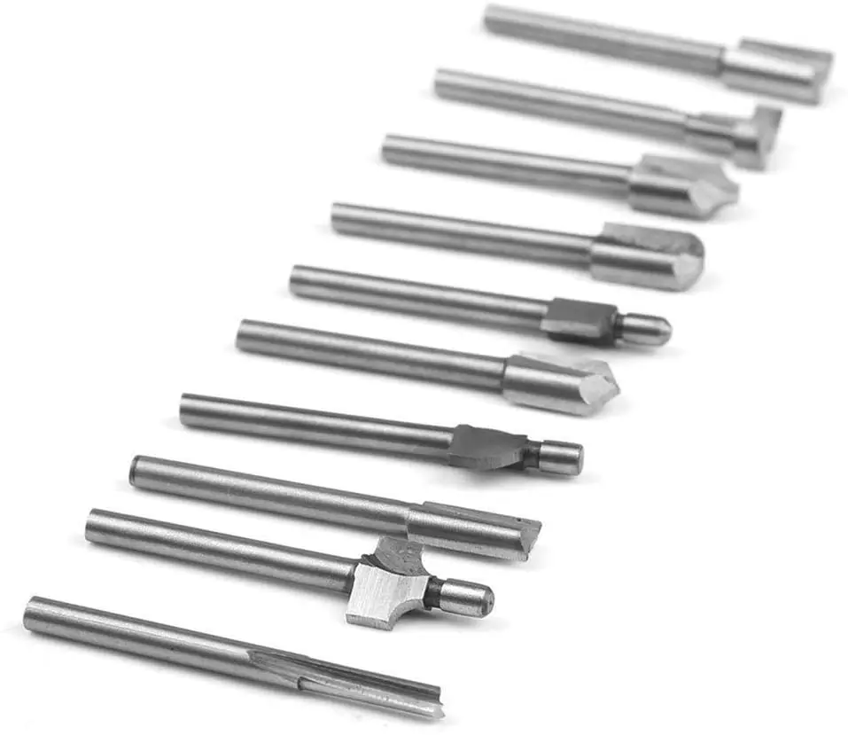 Десять резцов различных форм и размеров, обычно используются на электрических триммеров для отделки дерева, фрезерования и другой обработки.