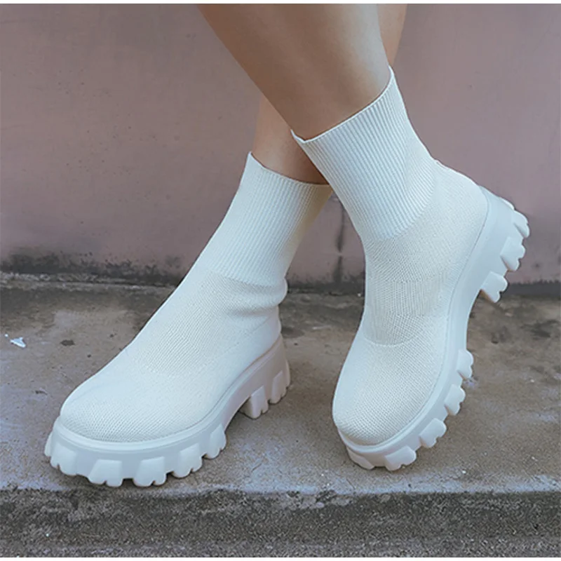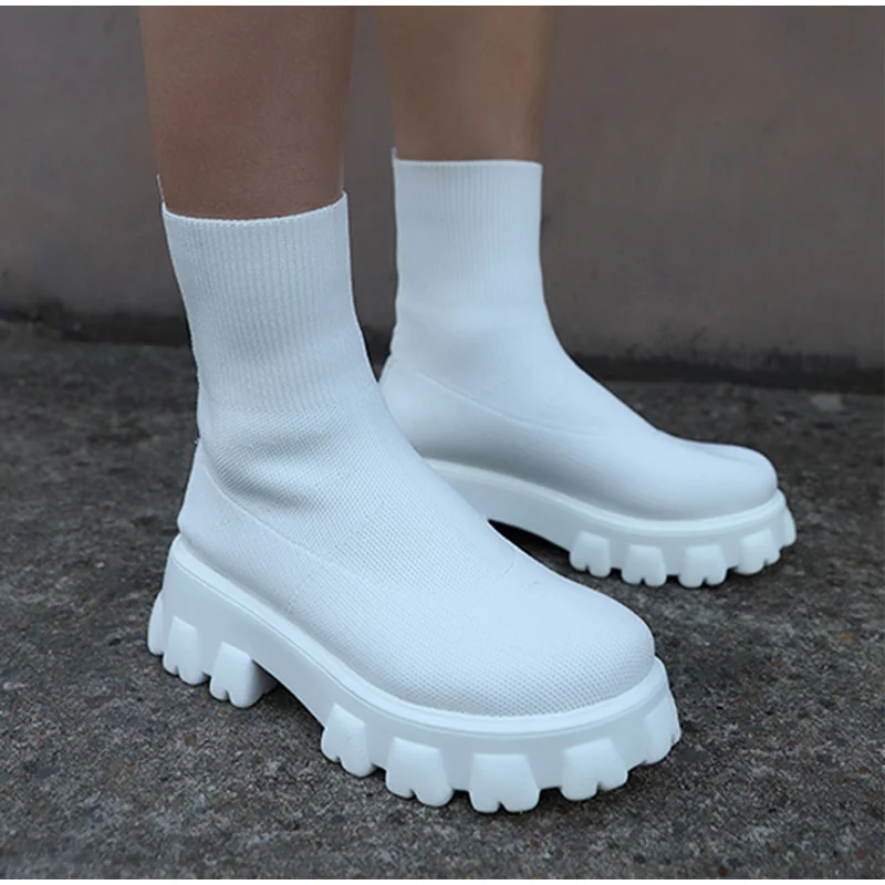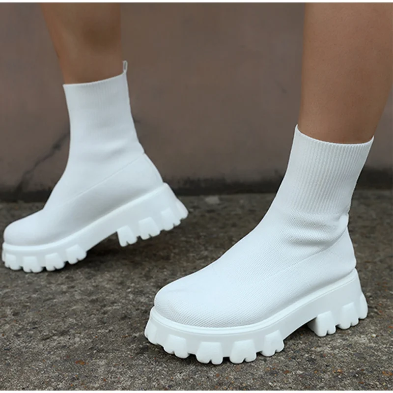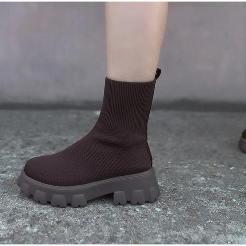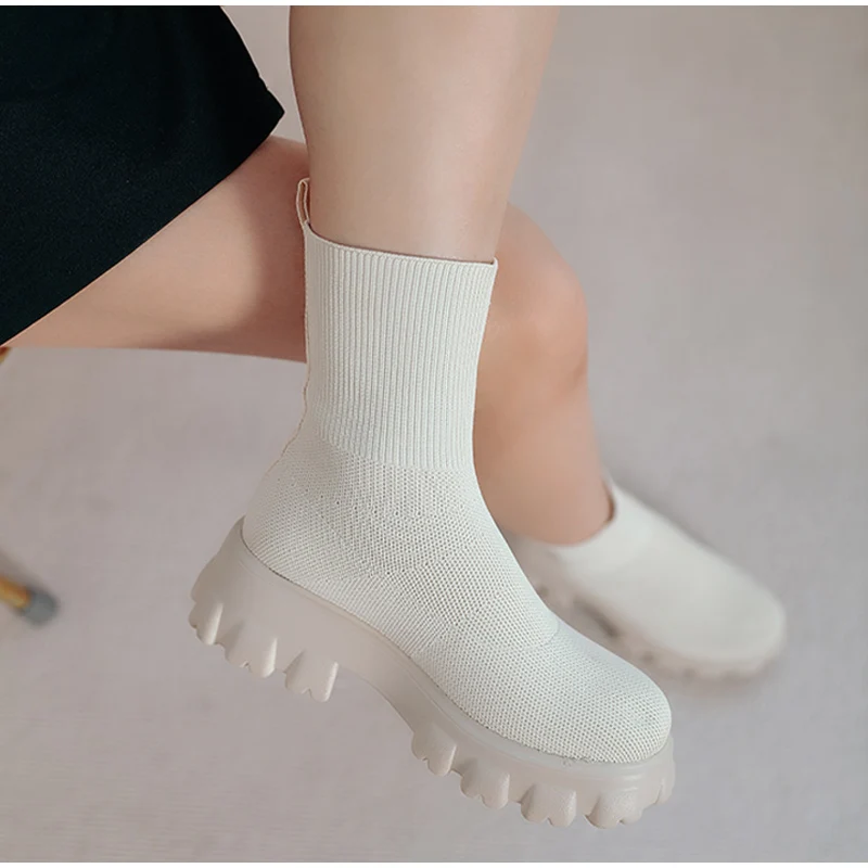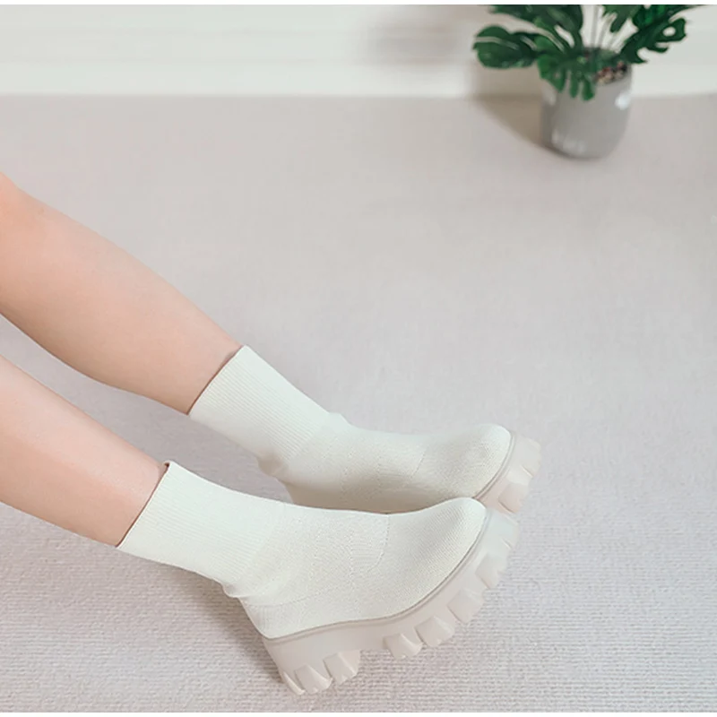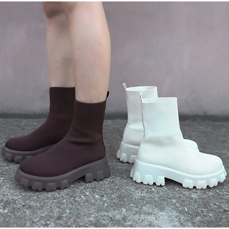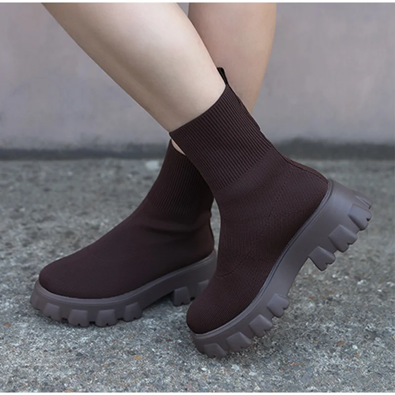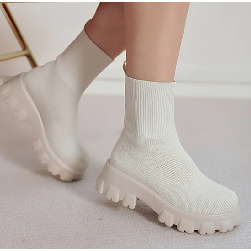 Женские вязаные сапоги до середины икры, женские сапоги на платформе, носки, Дамская Повседневная обувь без шнуровки на толстой подошве, сохраняющая тепло модная обувь 2021