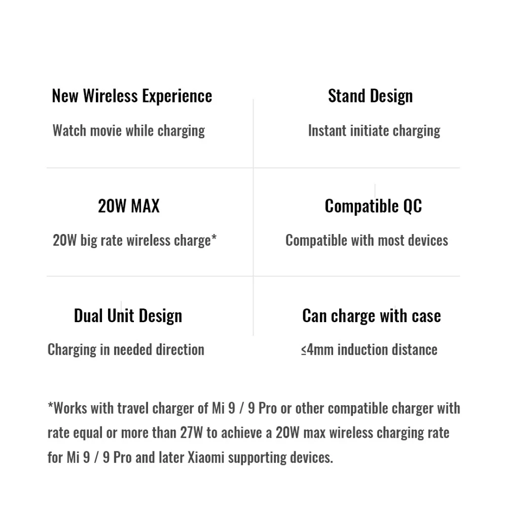 1. Это Беспроводное зарядное устройство Xiaomi 20 Вт, подставка ver., который дает мобильному телефону Mi 9 максимальную скорость зарядки 20 Вт, и дает микс 2S и микс 3 a макс. скорость зарядки 10 Вт, дает другим мобильным телефонам Qi EPP скорость зарядки 5 Вт-10 Вт. 2. Основной комплект беспроводной стойки 20 Вт-это Беспроводное зарядное устройство с кабелем; Расширенный комплект включает Беспроводное зарядное устройство, кабель и зарядное устройство для путешествий, как показано на фотографии комплекта; другие 2 пряди добавляются в соответствии с адаптером для разных регионов. 3. Для использования беспроводного зарядного устройства чехол для мобильного телефона не может быть металлическим или толстым, чем 4 мм.