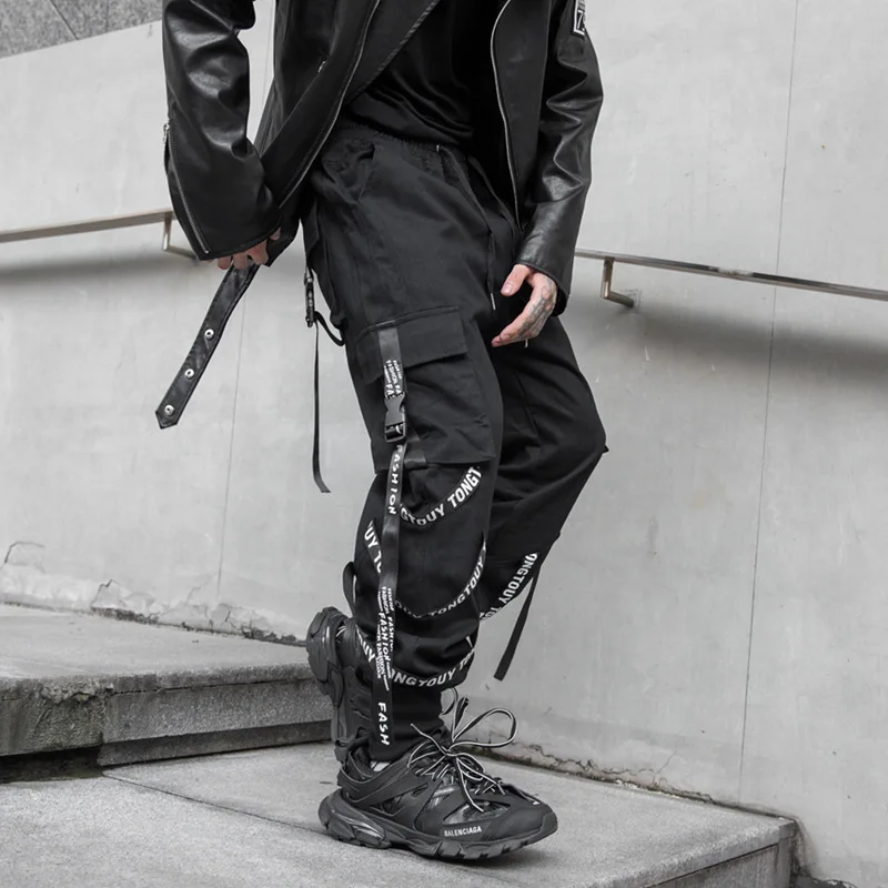 Новинка 2021, Мужская одежда, Японская уличная одежда, брюки-карго, Мужская одежда, комбинезон с лентой в стиле хип-хоп, брюки для бега, черные модные спортивные брюки