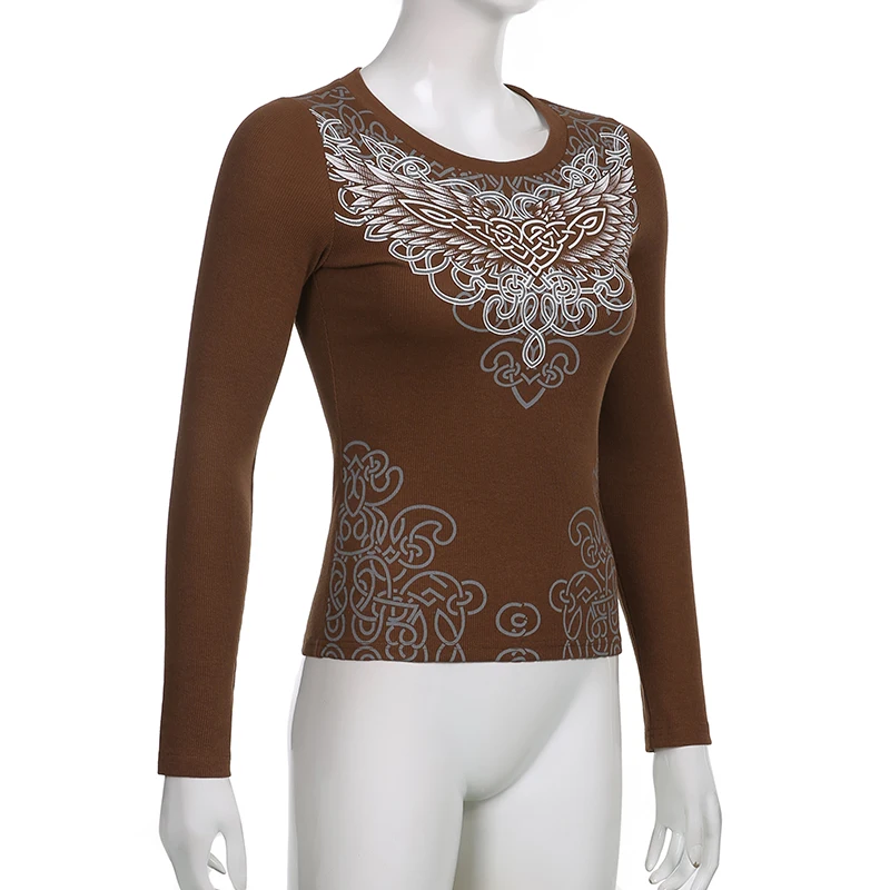 Женская футболка с длинным рукавом, круглым вырезом и принтом