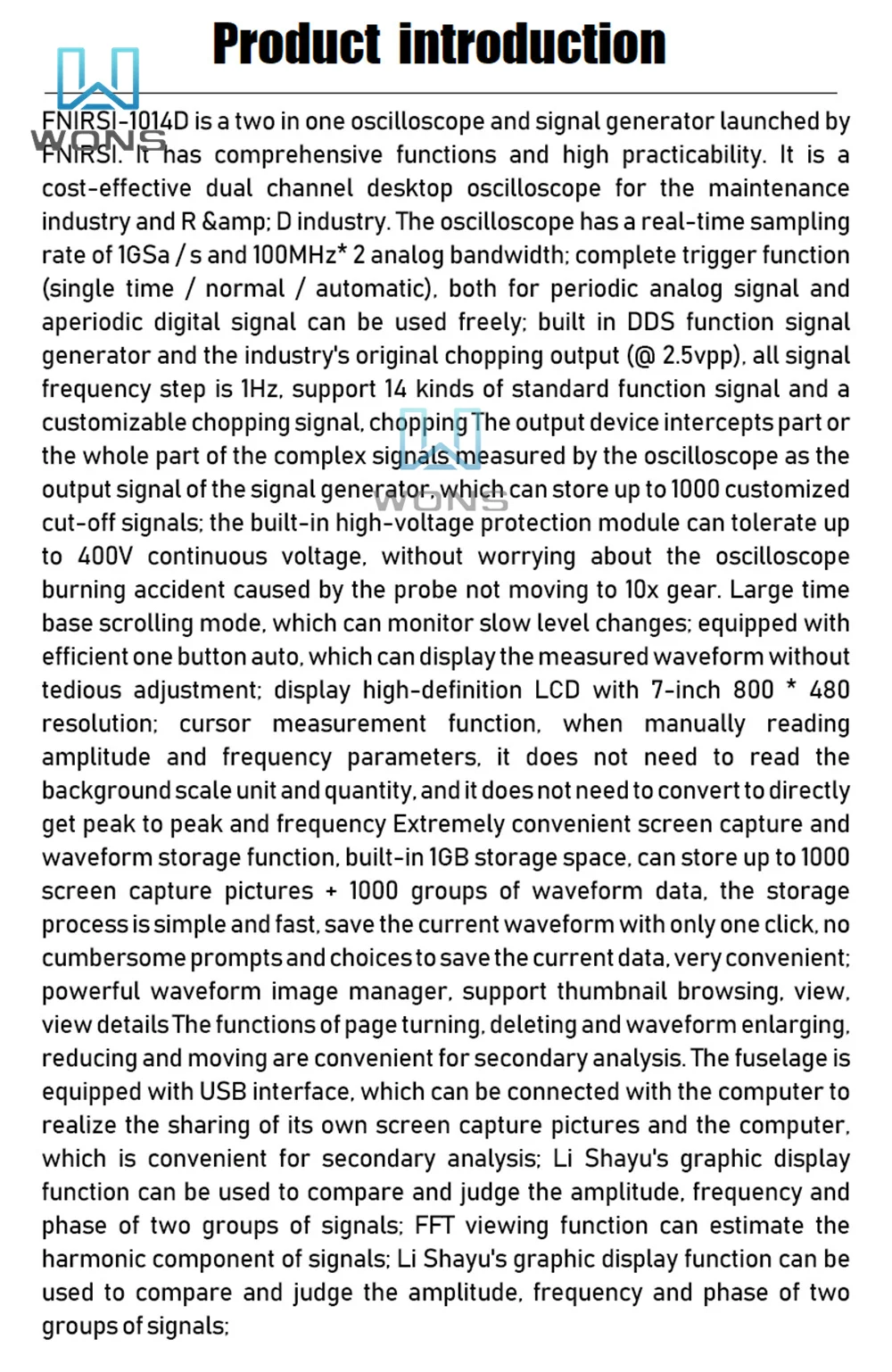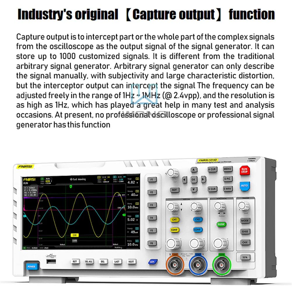 FNIRSI-1014DКомбинированный продукт осциллографа и генератора сигналов запущенОт FNIRSI. Комплексные функции и высокая практичность. ЭтоЭкономичный двухканальный Настольный осциллограф, подходящий дляИндустрия обслуживания и индустрия исследований и разработок.Осциллограф имеет частоту дискретизации в реальном времени 1 ГСА/с и аналогПолоса пропускания 100 МГц * 2; Полная функция запуска (одиночный/Обычный/автоматический),Свободно использовать для периодических аналоговых и непериодических цифровых сигналовСигналы; Встроенный генератор сигналов с функцией DDS и промышленныйОригинальный выход резки (@ 2.5vpp), все шаги частоты сигнала 1 Гц,14 видов стандартных функциональных сигналов и настраиваемый сигнал измельченияПоддерживаются. Устройство вывода измельчения перехватывает часть или всеСложные сигналы, измеренные осциллографом в качестве выходного сигналаГенератор сигналов может хранить до 1000 индивидуальных сигналов отключения;Встроенный модуль защиты от высокого напряжения выдерживает непрерывноеНапряжение до 400 В, не беспокоясь о сгорании осциллографаАвария, вызванная тем, что зонд не перемещается на 10-кратную передачу. БольшойРежим Прокрутки временной базы, может отслеживать медленные изменения уровня; ОснащенВысокоэффективный автоматический с одной кнопкой, может отображать измерительные формы волнБез утомительной настройки; Дисплей с 7-дюймовым разрешением 800*480ЖК-дисплей высокой четкости; Функция измерения курсора, ручное считываниеАмплитуда при настройке и параметрах частоты, нет необходимостиСчитайте единицу и количество фоновой шкалы, преобразование не происходитТребуется для прямого получения значения и частоты от пика к пику.Чрезвычайно удобный снимок экрана и функция хранения сигналов,Built-in-1GB места для хранения, можно хранить до 1000 скриншотов + 1000Группирует данные формы волн, процесс хранения прост и быстрый, сохраняетТоковая Форма волны с одной кнопкой, сохраняет текущие данные без громоздкостиПодсказки и выбор, очень удобно; Мощный диспетчер сигналов, поддержкаПросмотр миниатюр, просмотр, просмотр деталей, поворот страниц, удаление иТакие функции формы волны, как увеличение, уменьшение и перемещение, удобныДля вторичного анализа. Корпус оснащен интерфейсом USB, которыйМожно подключить к компьютеру для совместного использованияСнимки экрана с компьютера, что удобно для вторичного использованияАнализ; Функция графического отображения Li Shayu может сравнивать и оцениватьАмплитуда, частота и фаза двух наборов сигналов; Просмотр БПФДоступна функция оценки гармонических компонентов сигнала; LiФункция графического дисплея Shayu может сравнивать и оценивать амплитуду,Частота и фаза двух наборов сигналов.