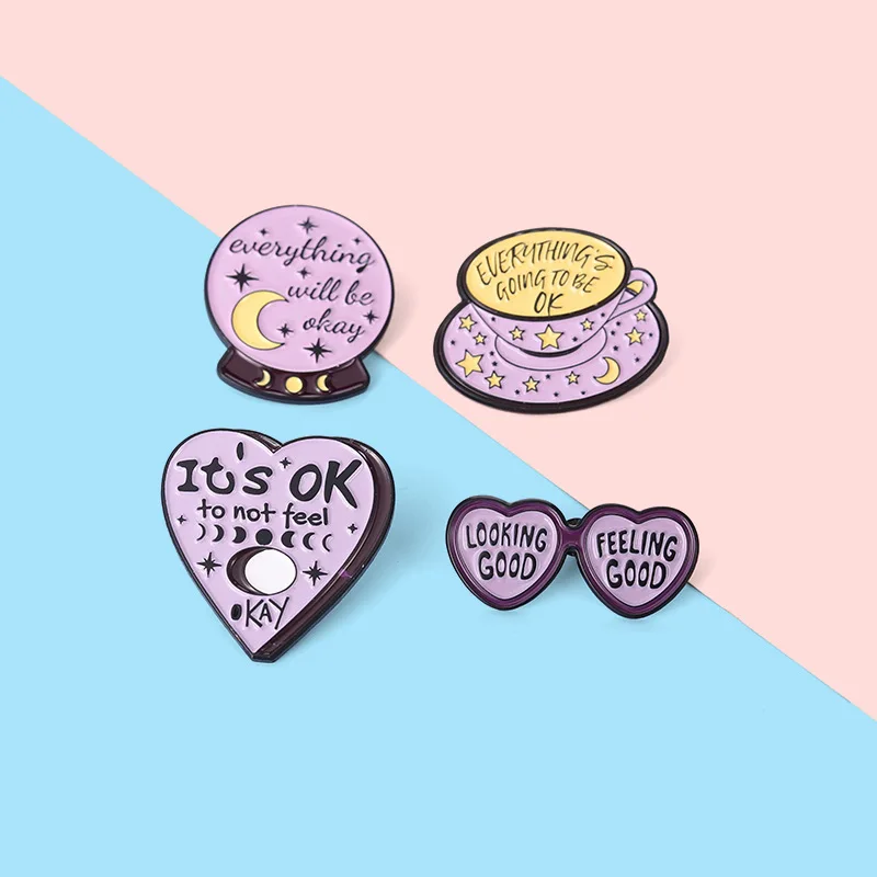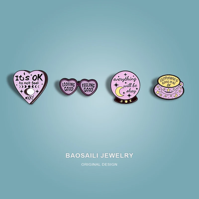 Эмалевые булавки с фиолетовым сердцем, фазой Луны, мотивационные ци...