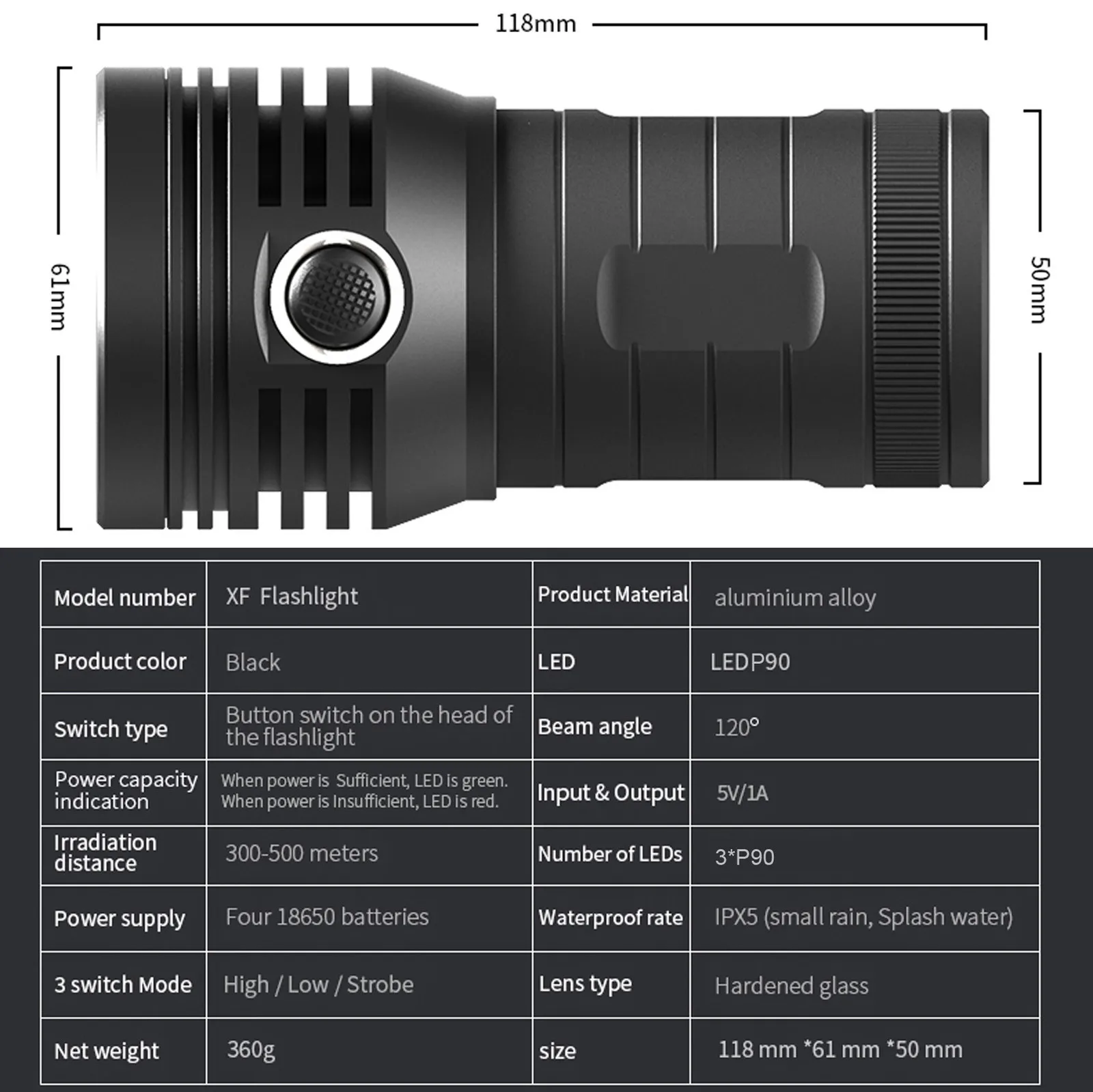 Параметры продукта Бренд: Pocketman Модель: XF маленькая стальная пушка Цвет: черный Светильник источник: XHP90 Режимы: 3 режима (высокий-низкий-Стробоскоп); (нажмите и удерживайте для выключения 2s) Материал: алюминиевый сплав Диапазон: 300-500 метров Угол луча: 120 градусов Аккумулятор: встроенный аккумулятор 4*18650 Переключатель: нажмите переключатель Метод зарядки: зарядка через микро порт Вход и выход: 5 В 1A Водонепроницаемость: IPX-5 Количество лампочек: три