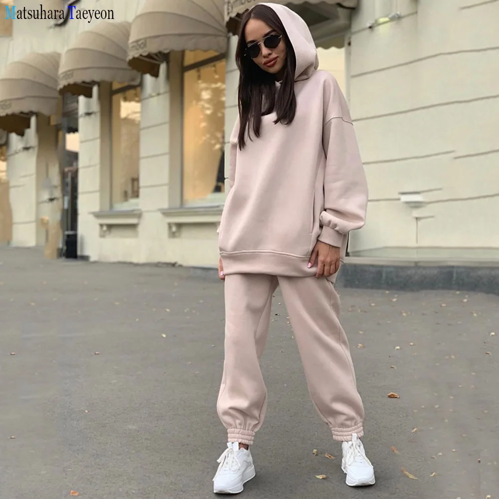 Женские костюмы на осень и зиму, блузка с капюшоном и штаны, Модный женский пуловер с карманами, комплект из 2 предметов, Женская свободная одежда