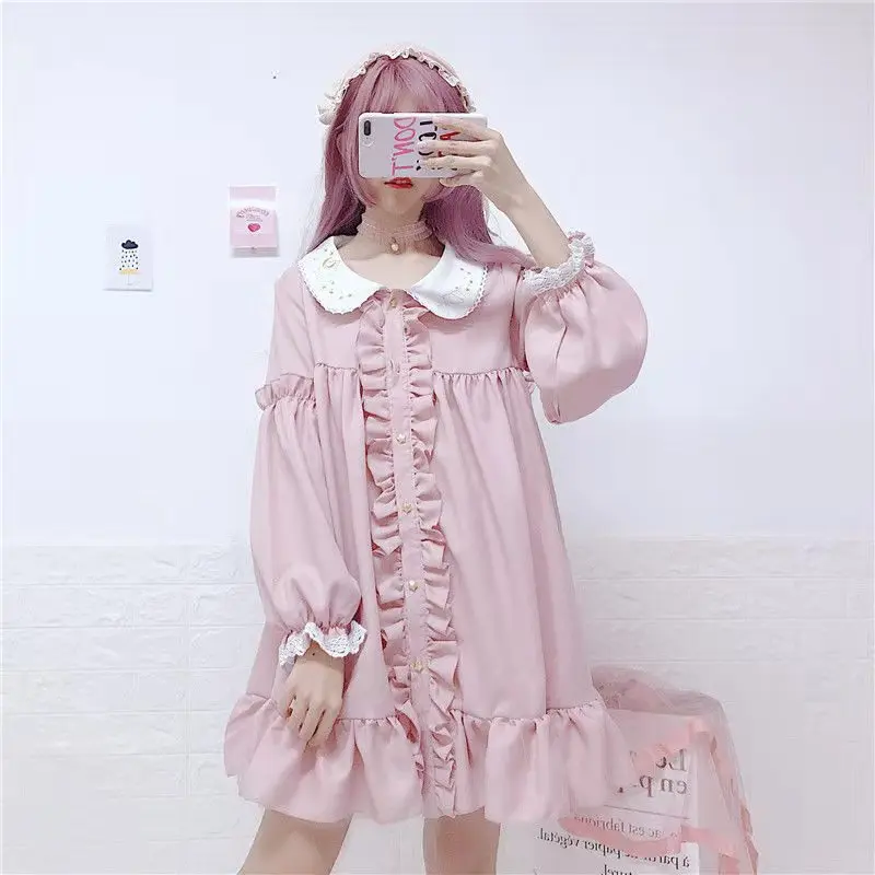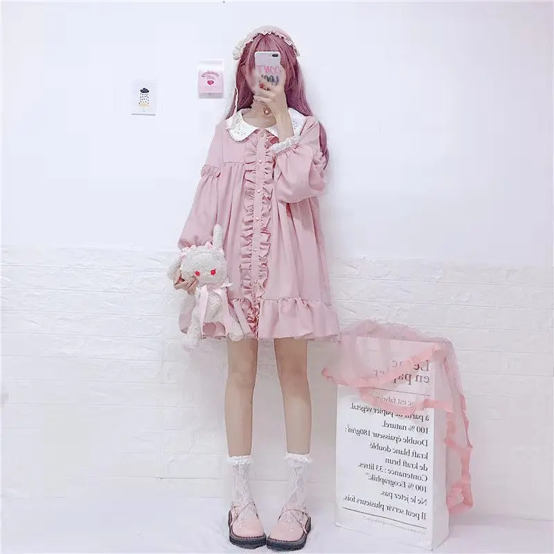 Мини-платье для девочек, повседневное розовое платье принцессы, одежда в стиле "Лолита", милое платье с длинным рукавом, милое платье в стиле "Лолита", кавайное платье
