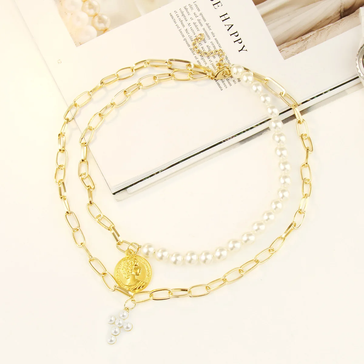 Женское винтажное ожерелье в стиле барокко, нестандартное жемчужное колье с цепочкой с застежкой, модное металлическое ожерелье в стиле панк с крестом-бабочкой, кулон