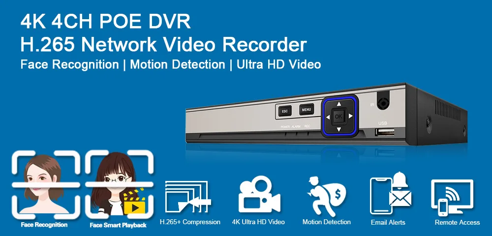 H.265 4CH 4K и 8MP POE NVR характеристики: