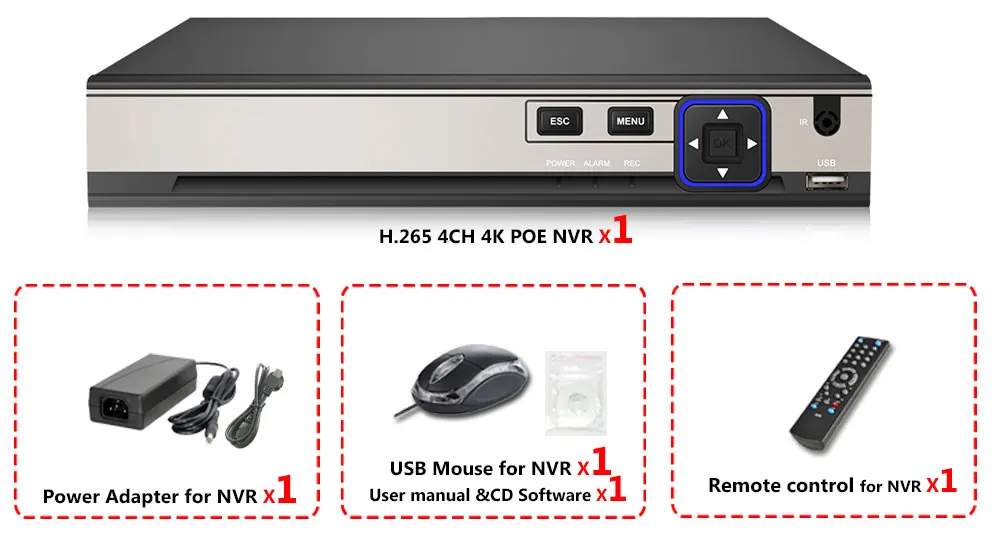 1 сетевой видеорегистратор 4CH 4K POE NVR;1 x Блок питания для NVR;1 х USB мышь для NVR;1 компакт-диск программного обеспечения для NVR;1 пульт дистанционного управления для NVR;Жесткий диск в комплект не входит!