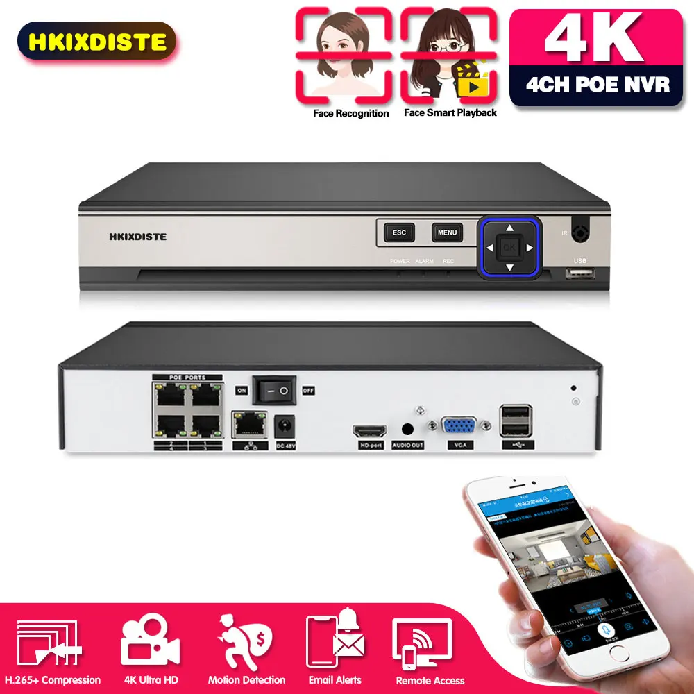 Камера видеонаблюдения H.265 4 канала 8 каналов 4K POE NVR для HD 1080P 4 МП 5 Мп 8 Мп POE IP NVR AI сетевой видеорегистратор с функцией обнаружения лица
