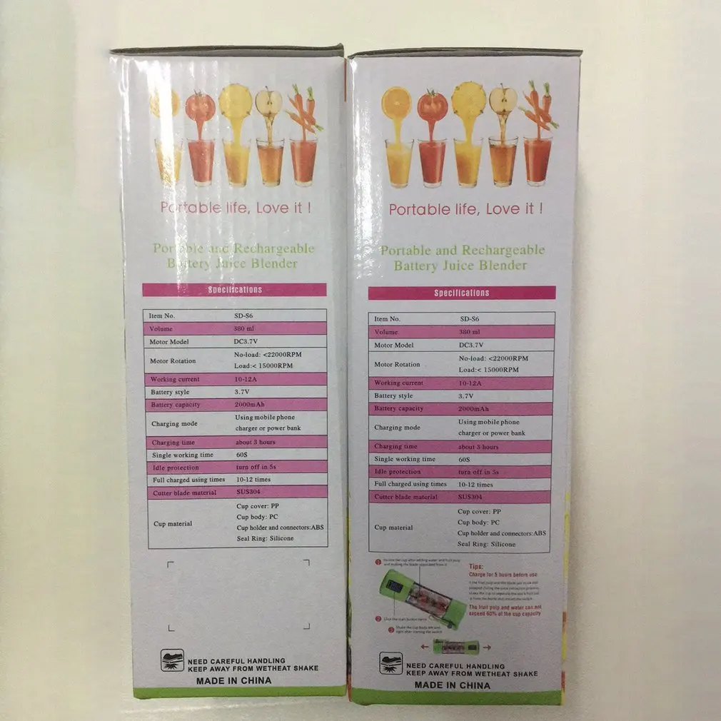 Особенности: 1. Высокая безопасность: портативный миксер не содержит Бисфенол А и изготовлен из экологически чистой пищевой PP, PC, ABS и нержавеющей стали 304. 2. Дизайн безопасности: Уникальный дизайн безопасности, включая шнурок, нескользящее, амортизирующее основание, для защиты вашей безопасности при изготовлении вкусного сока. 3. Сильный и эффективный: соковыжималка чашки оснащен сенсорным дисплеем 304 нержавеющая сталь лезвия и 3,6 вольтным и, что может привести к тому, что вы стакан свежевыжатого смузи, молочного коктейля, свежий сок, И т. Д. Всего за 90 секунд. 4. Зарядка типа USB: чашка соковыжималки USB оснащена перезаряжаемой батареей емкостью 2000 мАч, которая может заряжаться различными способами, такими как мобильное питание, адаптер и зарядка компьютера. 5. Простота в эксплуатации: мини-миксер легко моется, просто добавьте воду и нажмите кнопку питания, чтобы начать режим самоочистки. По соображениям безопасности Не погружайте блендер в воду. Описание: Электрическая соковыжималка весит светильник, подходит для любителей сока и путешествий и подходит для использования в помещении и на открытом воздухе. Характеристики: Материал: пищевой PP + PC + ABS + 304 нержавеющая сталь Размер: 70*70*235 мм Лезвие: 2 лезвия Аккумулятор: 2000 мАч Емкость: 380 мл Скорость без нагрузки: 20000 ± 15% об/мин Напряжение: 3,6 V, 24 Вт/A Время зарядки: 3-4 часа Упаковка: Английская упаковка Посылка включает в себя: 1 * электрическая соковыжималка 1 * USB кабель 1 * цветная коробка