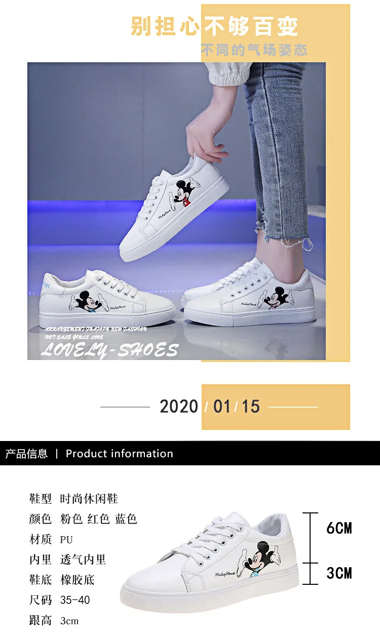Детские небольшие кроссовки на плоской подошве для женщин, однотонные белые кроссовки, мультяшная женская спортивная обувь с Микки Маусом, 2021