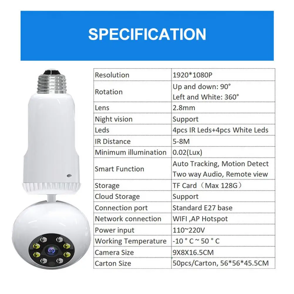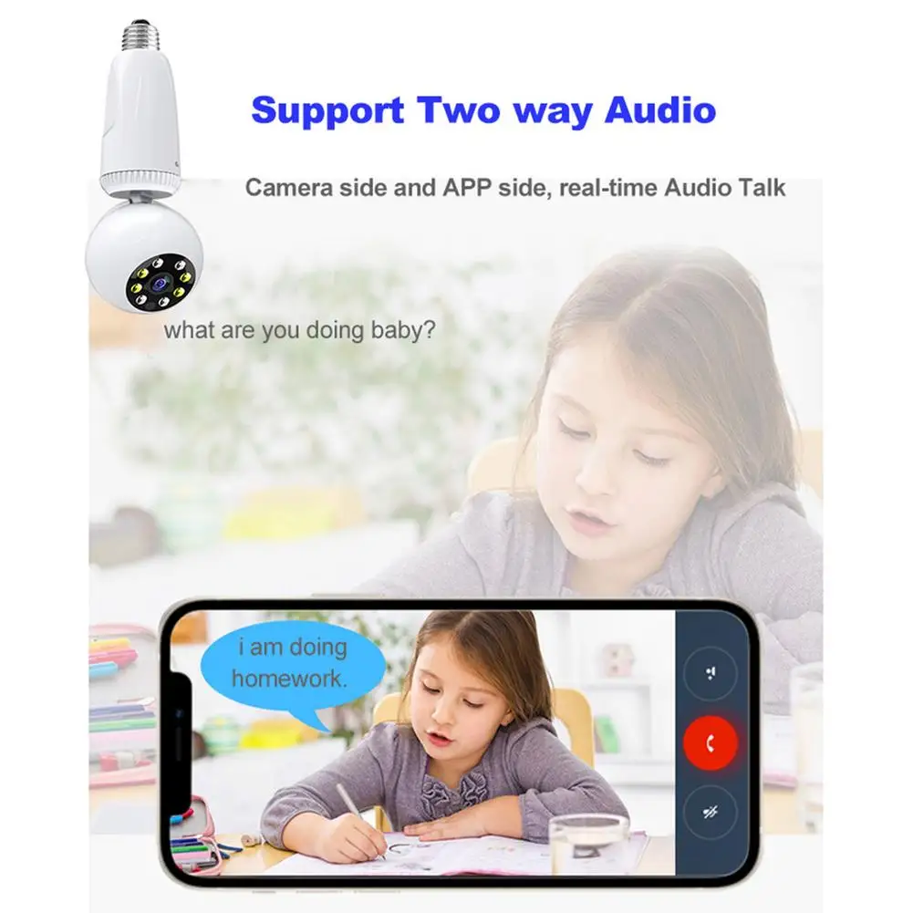 1. Дистанционное управление и панорамный просмотр: пожалуйста, используйте точку доступа для первого подключения! Эта камера в настоящее время совместим только с 2,4 ГГц Wi-Fi (не поддерживает 5G Wi-Fi). После подключения камеры к Wi-Fi прямая трансляция может быть доступна через устройство для iPhone/iPad. Вы можете использовать его в качестве детской камеры, чтобы дать вашему малышу лучший уход в любое время и в любом месте.2. Обнаружение движения и Двухканальное аудио: эта камера безопасности лампы отправит Оповещение на ваш мобильный телефон в режиме реального времени, когда обнаруживает движение, чтобы защитить ваш дом и следовать за вами. Вы можете установить время обнаружения по мере необходимости. Эта ламповая камера позволяет услышать ваш голос в любое время и в любом месте, и это удобно и практично. Его можно использовать в качестве камеры для серваля для детей или домашних животных.3. 1080P HD и ночное видение: Full HD 1080P, 2,0 MP домашняя камера безопасности, высококачественная оптика для лучшего захвата изображения, автоматический баланс белого и экспозиция. Светильник наводнения и инфракрасный светильник ночного видения, инфракрасное автоматическое переключение. В течение дня или ночью, эта камера может предоставить вам красочные изображения.4. Шифрование видео и шифрование учетной записи: Эта ip-камера использует уникальную технологию шифрования для сохранения видео на sd-карте. Даже если ваша камера или sd-карта украдена, никто не может копировать видеофайлы sd-карты через кард-ридер. Видео файлы на sd-карте могут быть доступны только в вашей учетной записи.5. Простая установка: Наша ламповая камера поставляется с базой, которую можно регулировать под любым углом. Он может быть установлен непосредственно на розетке, где обычно находится лампа, только вам нужно убедиться, что позиция находится в диапазоне wifi.Характеристики:Цвет: белыйРазрешение: 1920*1080Пиксель: 2 миллионаРазмеры: около 9 см х 8 см x 16,5 см/3.54x3.15x6.50inchНочной режим: инфракрасное ночное видение + СВЕТОДИОДНЫЙ полноцветныйСвязь режим: 2-полосная аудиоПредупреждение: обнаружение движения и автоматическое отслеживаниеМетод записи: непрерывная запись, Аномальная запись обнаруженияСохранение видео: tf-карта, облачное хранилище, Поддержка карт памяти (16-128G) опциональноАдаптер: блок питания E27 держатель лампы адаптерУгол поворота: 360 ° влево и вправо, 90 ° вверх и внизУпаковочный лист:Камера * 1Основание * 1Руководство * 1Примечания:Из-за световых эффектов и углов съемки цвет изделия и показанный на изображении может иметь нюанс.Из-за ручного измерения возможны отклонения в размере изделия.
