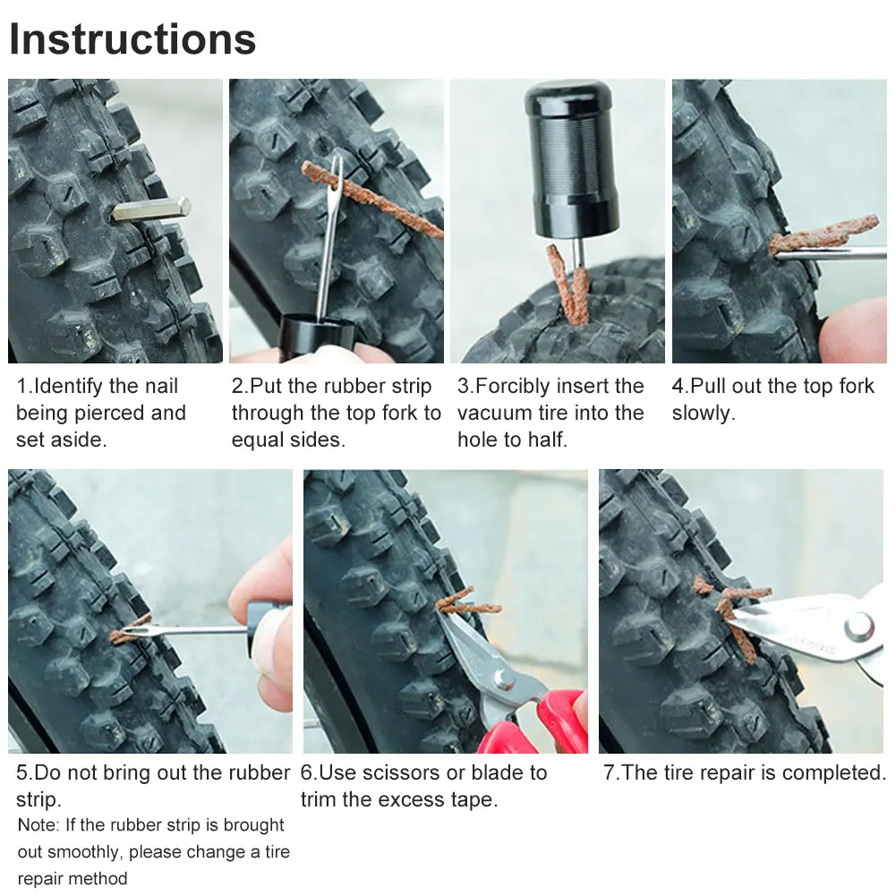 Этот инструмент предназначен только для бескамерных велосипедов. Для ремонта проколов он может вставлять 2 полоски за раз. Пожалуйста, замените другой метод, если 2 полосы не достаточно велики, чтобы подключить отверстие.