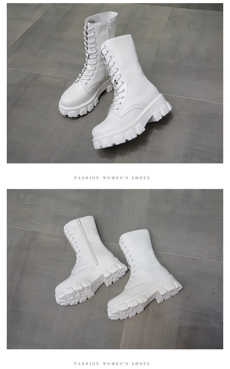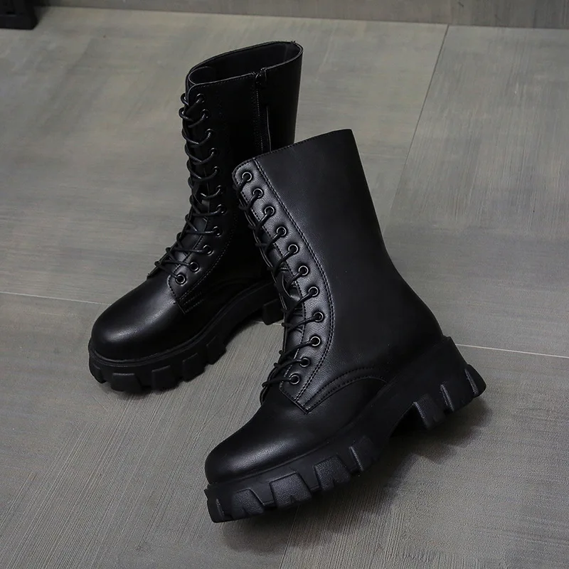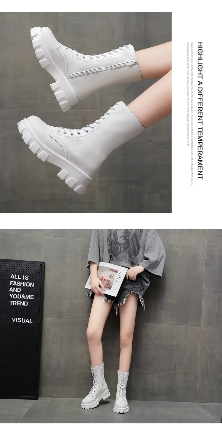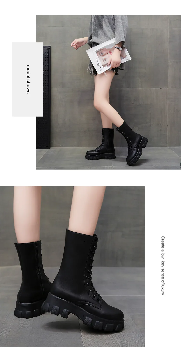 Женские мотоциклетные ботинки на платформе, черные ботинки из искусственной кожи на высоком каблуке, со шнуровкой, обувь на плоской подошве для девочек, 2019