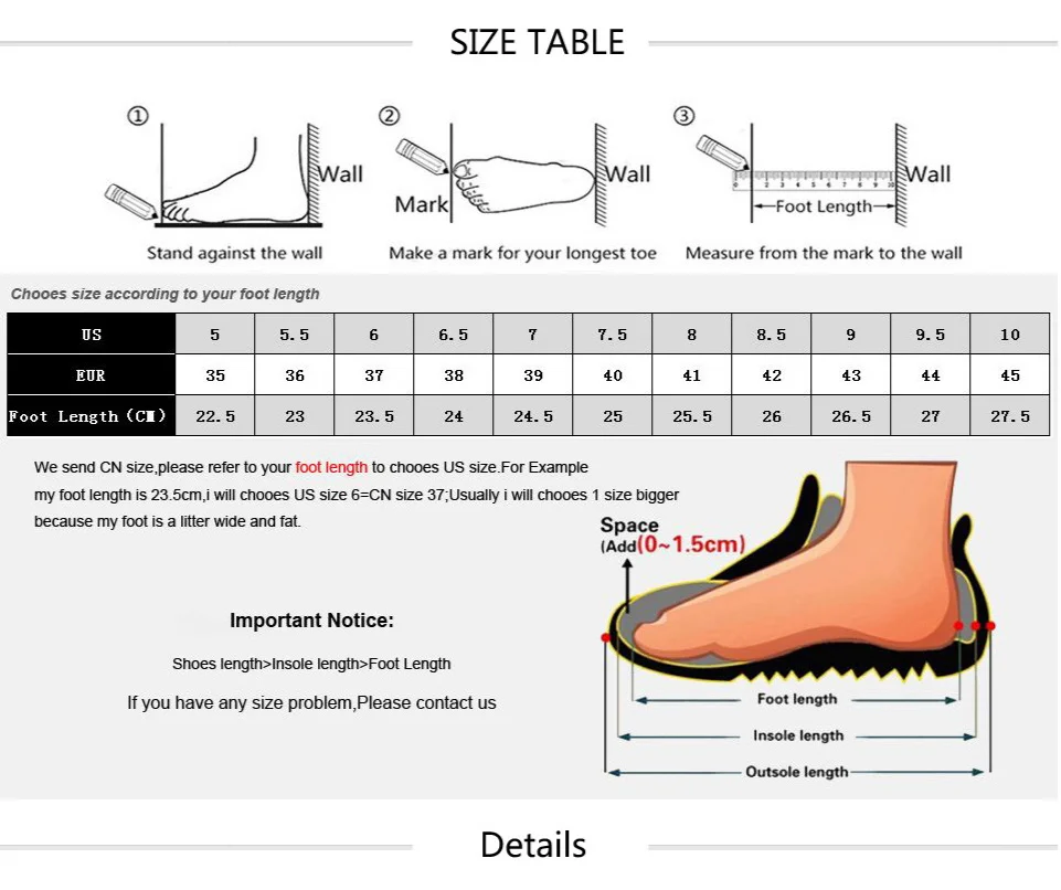 Примечание: Пожалуйста, выберите размер обуви в соответствии с длиной Вашей стопы, а не длиной стельки.