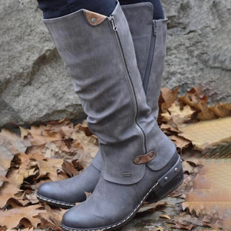 Зимние женские Винтажные ботинки до середины икры, женская обувь из искусственной кожи на молнии, женская повседневная обувь с шитьем, женская мягкая обувь
