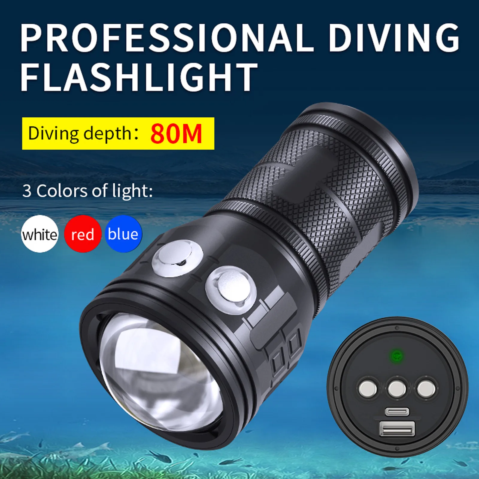 Многофункциональный фонарик для дайвинга, лм, светодиодный подводный фонарик для фотосъемки, 80 м, Ipx8, фонарик без батарей