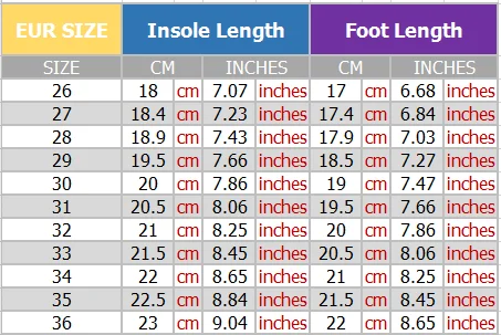 ***Каждый стиль обуви имеет разный вариант обуви, пожалуйста, проверьте размер вашего ребенка правильно в соответствии с длиной стельки в нашей таблице размеров обуви!