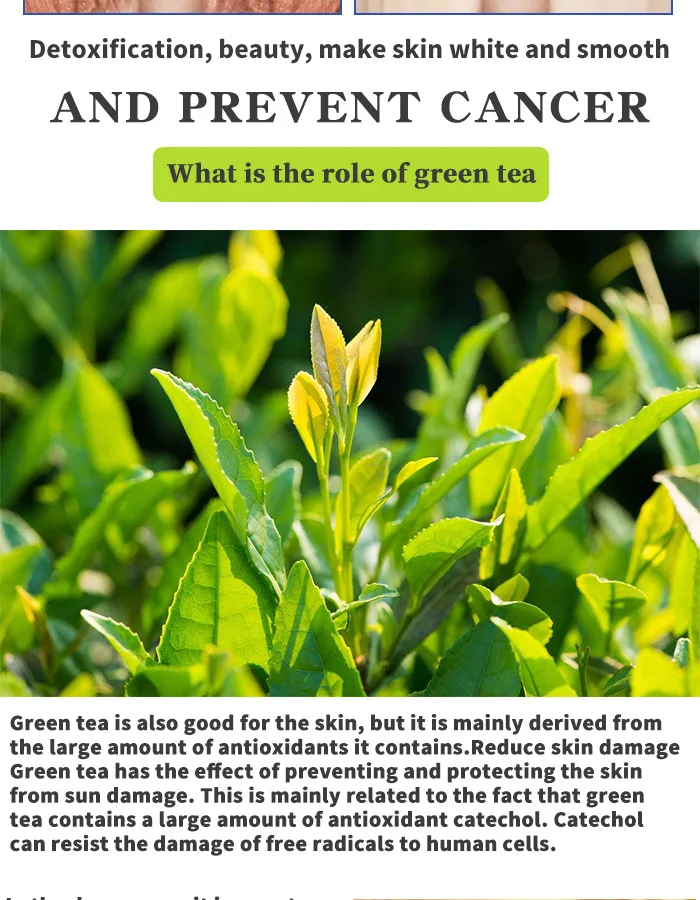 Ингредиенты зеленого чая: Зеленый чай также хорошо подходит для кожи, но в основном он исходит из большого количества антиоксидантов, которые он содержит. Уменьшает повреждение кожи Зеленый чай обладает эффектом предотвращения и защиты кожи от солнечных повреждений. Это в основном связано с большим количеством антиоксидантного катехола в зеленом чае. Катехол может сопротивляться повреждению человеческих клеток свободными радикалами.