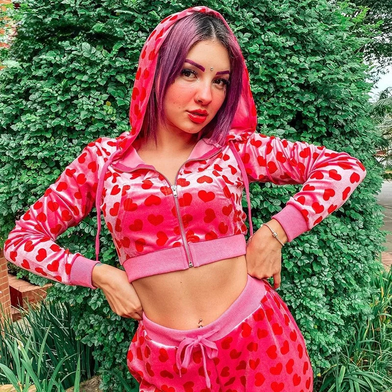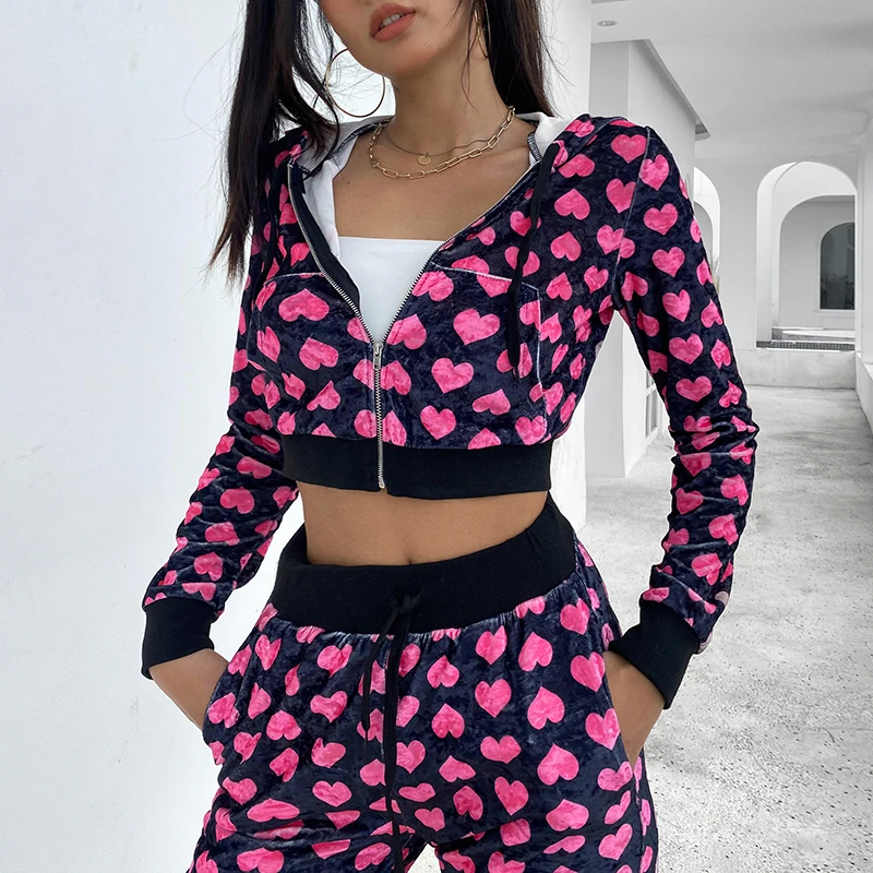 Укороченный розовый топ с принтом в виде сердца, осенняя Вельветова...