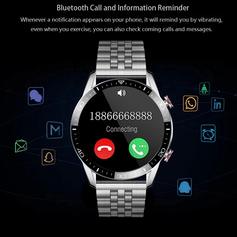 【Несколько функций, напоминания о звонках и сообщениях Поддержка Bluetooth 4,0. Когда умные часы подключены к вашему телефону, вызов, Facebook, QQ, SMS и WeChat будут напоминать вам через яркий экран вибрации не будут пропущены входящие звонки и сообщения. Вы можете связаться и связаться с друзьями и семьей в любое время. Кроме того, будильник и напоминание о сидячем положении помогут вам создать хорошую привычку к работе и отдыху, часы также поставляются с функцией секундомера.