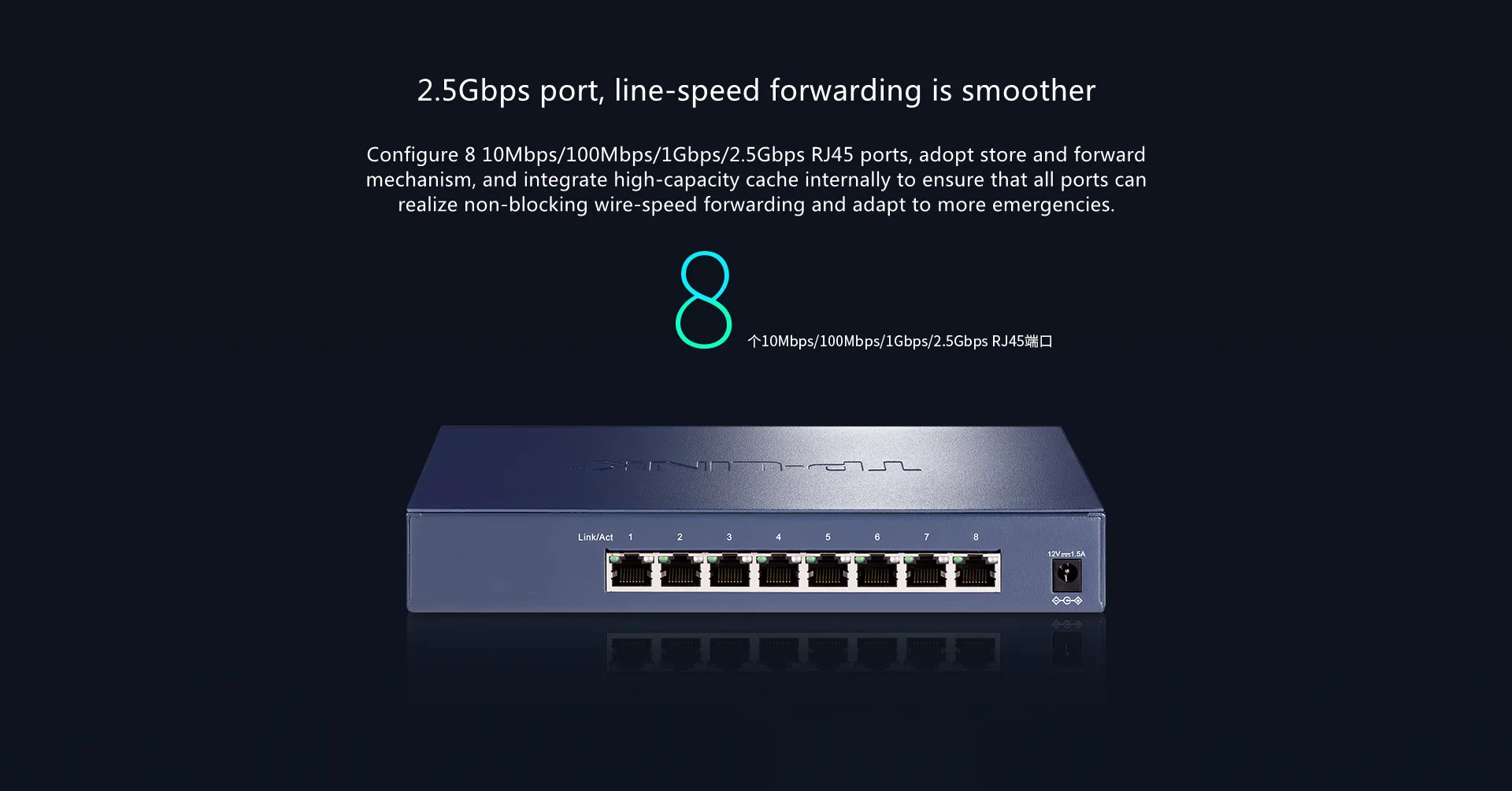 > 8-2,5 Гбит/с сетевые порты> Все порты имеют возможность передачи проволочной скорости> Подключи и работай, конфигурация не требуется> Поддержка стандартов IEEE 802.3ab, 802.3bz