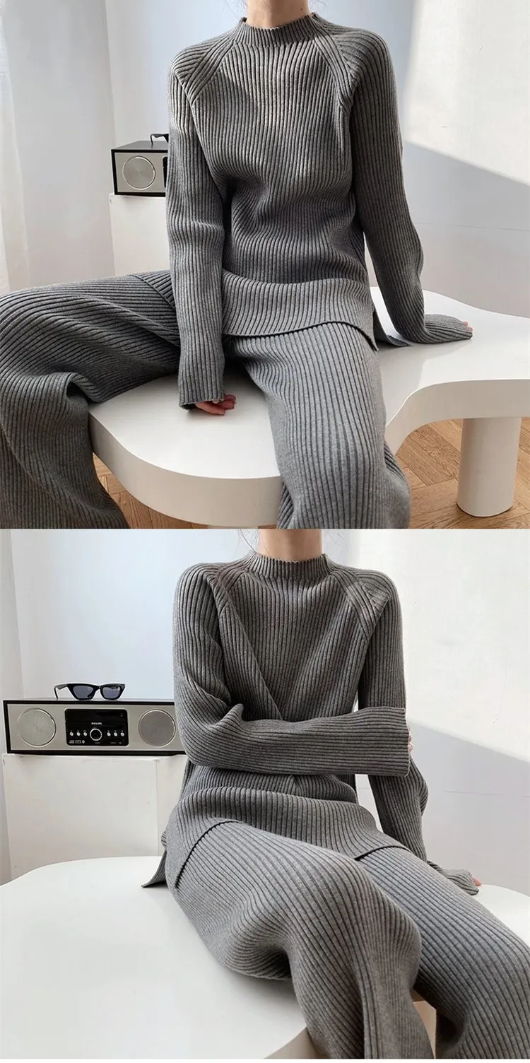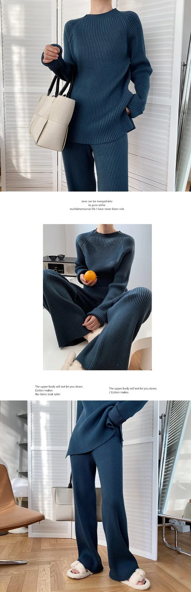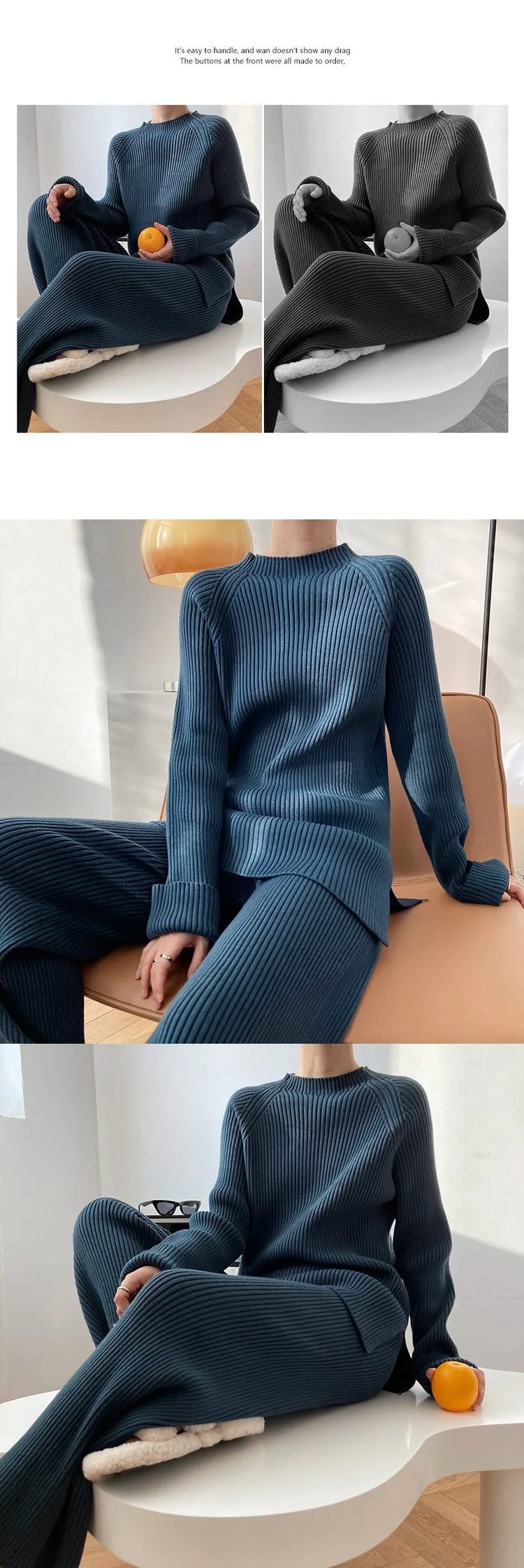 Женский трикотажный костюм из двух предметов, теплый свободный брючный костюм с широкими штанинами, для зимы