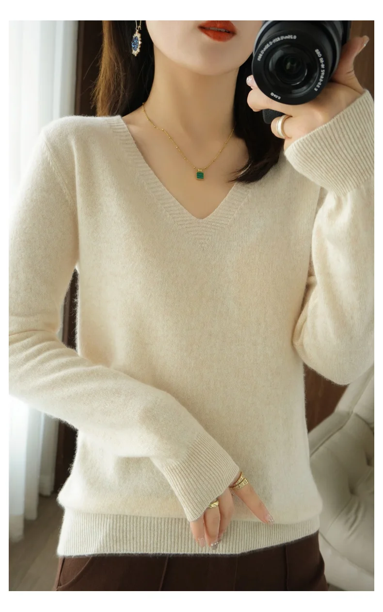 Женский кашемировый свитер с V-образным вырезом и длинным рукавом