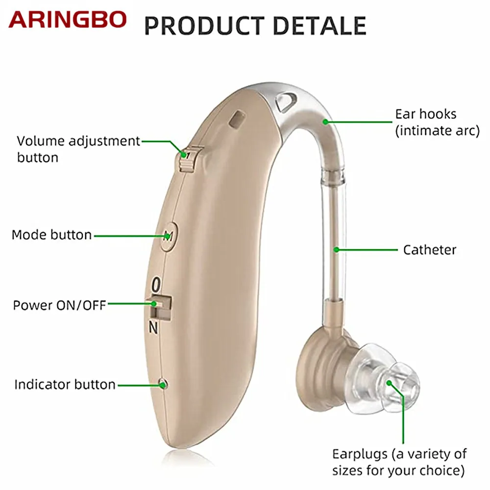 Особенности1. Мини BTE дизайн2. Высокая мощность с чипом шумоподавления3. 4 режима работы, многофункциональный дизайн4. Напоминание о низкой мощности, зарядка от USB(Не нужно менять аккумулятор)5. Зарядка 4-6 часов, работа 80 часовПараметрыНазвание продукта: перезаряжаемый BTE слуховой аппаратЦвет: бежевый/синий с зарядным устройствомЗарядное устройство: DC 5V150mA ~ 1AВес: приложение. 6,5 гРазмер: 15x40x10ммМаксимальный выход: 129 + 4 дБМаксимальное усиление: 38 ± 5 дБОбщее гармоническое искажение: ≤ 5%Эквивалентный входной шум: ≤ 28Посылка в комплектеСлуховой аппарат-1 шт.4 x ушной разъем (разные размеры)1 x Руководство пользователя1 х коробка для хранения1 х USB кабель для зарядкиС зарядной головкойНапоминаем1. Отрегулируйте громкость до начала ношения.2. Выберите наушник немного большего размера, чтобы избежать Уистлера.3. Увеличивайте громкость постепенно, чтобы избежать внезапного увеличения звука.4. Если вы услышите Воющий звук, проверьте, подходит ли ушной (силикагель) Размер штекера,Соответствующий выбор беруши и подключен, убедитесь, что нет утечки воздуха.5. Держите ушную вилку в чистоте.