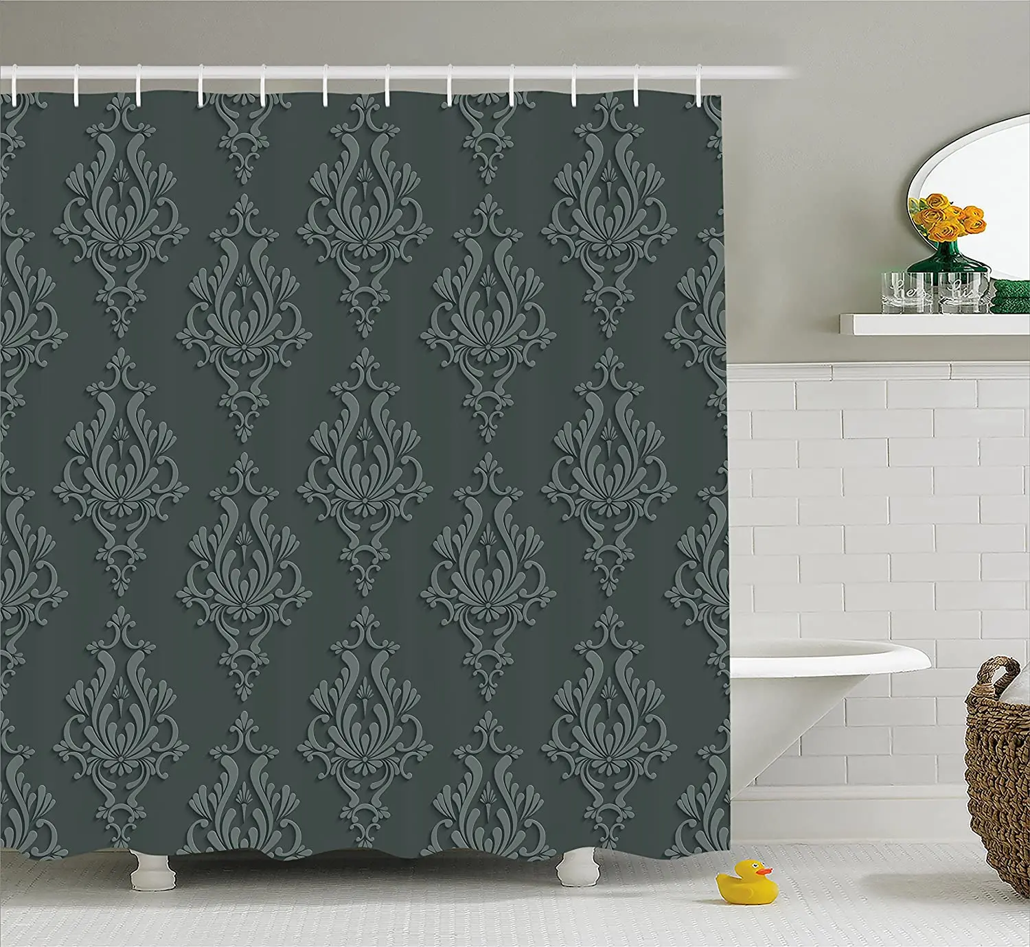 Темно-серая занавеска для душа, античный Дамаск в 3D стиле, Классическая старомодная Водонепроницаемая занавеска для ванной из полиэстера с цветами и крючками