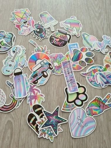 Наклейки не голографические. Они не металлические и не имеют иридизма. Это обычные наклейки и эффекты окрашены. Теперь я понимаю это "голографическая наклейка graffiti".