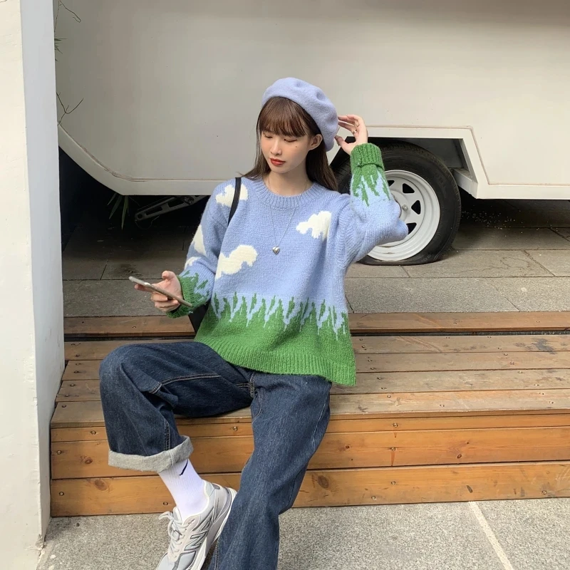 Свитер Женский вязаный с принтом, теплый Свободный пуловер с круглым вырезом, с длинным рукавом, уличная одежда с принтом облаков и трав