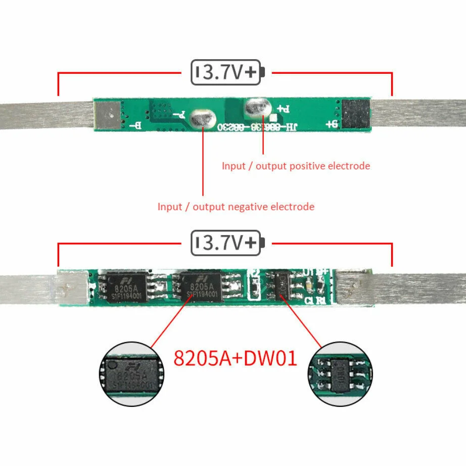 Параметры:Размер: 18*3,6 мм (прибл.)Напряжение перезарядки: 4,23 и plusmn; 0,05 ВДиапазон перенапряжения: 4,25 и plusmn; 0,05 ВПереразряда Диапазон напряжения: 2,54 & plusmn; 0,1 VТок обнаружения перегрузки по току: 2-3 A/ 5-6 AОсновные функции: защита от перезаряда, защита от разрядки, защита от короткого замыкания, защита от перегрузки по току.