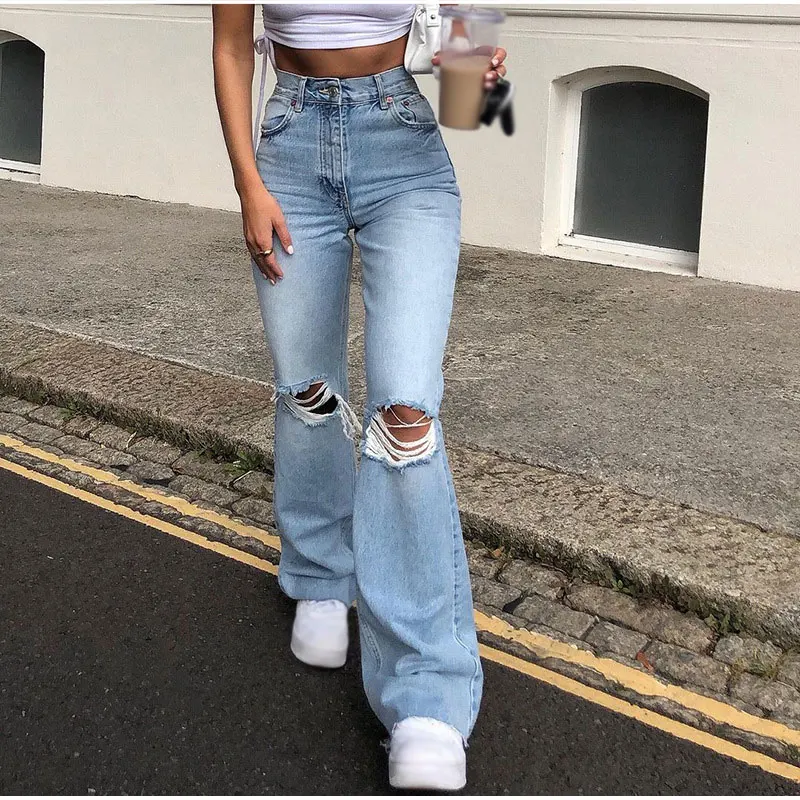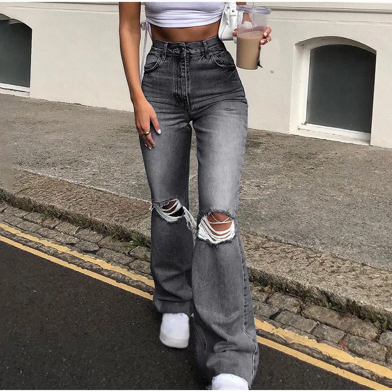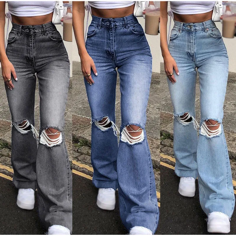 Джинсы женские рваные в стиле Харадзюку, Модные расклешенные брюки ...