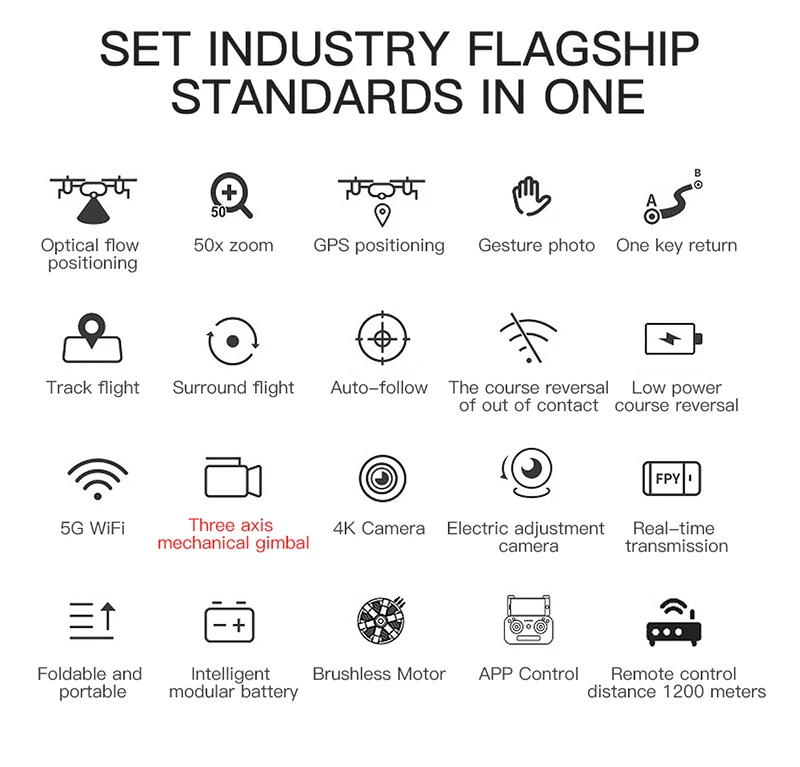 1: 3-осевой поворотник объектив оснащена широкоугольным 4K высокой четкости Wi-Fi, которая может регулироваться от заявленного из-за угла съемки,Фронтальная камера на пульте дистанционного управления. 3-х осевой поворотник делает летательные аппараты съемки видео четче и более стабильным, и угол наклона делает поле зрения шире.2: благодаря встроенному компьютеру передача изображения составляет на самом деле 3 км (в безбарьерной среде), а передача изображения на большие расстояния увеличивает чувство опыта и зрения потребителей.3: точное позиционирование, с GPS точным позиционированием, может достичь возврата одной кнопки, без возврата сигнала, низкое энергопотребление, во избежание потери полета.4: ультра длинная выносливость 11,1 В 2600 мА литиевая батарея, с выносливостью около 28 минут, увеличивает чувство полетаОпыт.5: таможенный маршрут. Вы можете нарисовать изображение, которое вы хотите лететь в приложении.6: интеллектуальное слежение, объемный полет, управление ладонями, позиционирование карты в реальном времени, БПЛА, карта вне управления, планирование маршрута, приложениеМобильный телефон управления, одна кнопка возврата, вверх и вниз, вперед и назад, левая и правая сторона полета, автоматическое переключение оптического потока/GPS.7: бесщеточный двигатель, обеспечивает более мощную мощность и более прочный срок службы, сильное чувство скорости, сильный взрыв, хорошее сопротивление ветра.