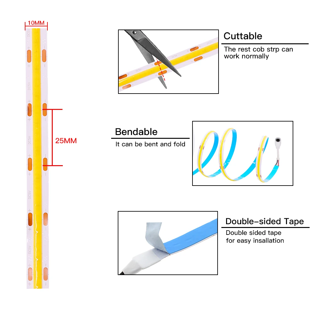 Модель: Светодиодная лента USB COBНапряжение: DC5V USBКоличество СВЕТОДИОДНЫЙ: 320 светодиодный s/mУровень водонепроницаемости: IP20 не водонепроницаемыйСветильник, цвет: теплый белый/натуральный белый/белый светильник/красный/зеленый/синийЦветовая температура: теплый белый (3000K)/натуральный белый (4000K)/белый светильник (6000K)FPCB ширина: 10 ммДлина резки: 320 светодиодов/м-каждые 32 ммИндекс цветопередачи: Ra>90Рабочая температура: -20 ℃-+ 45 ℃Температура хранения: -20 ℃-+ 60 ℃Угол обзора: 180 °