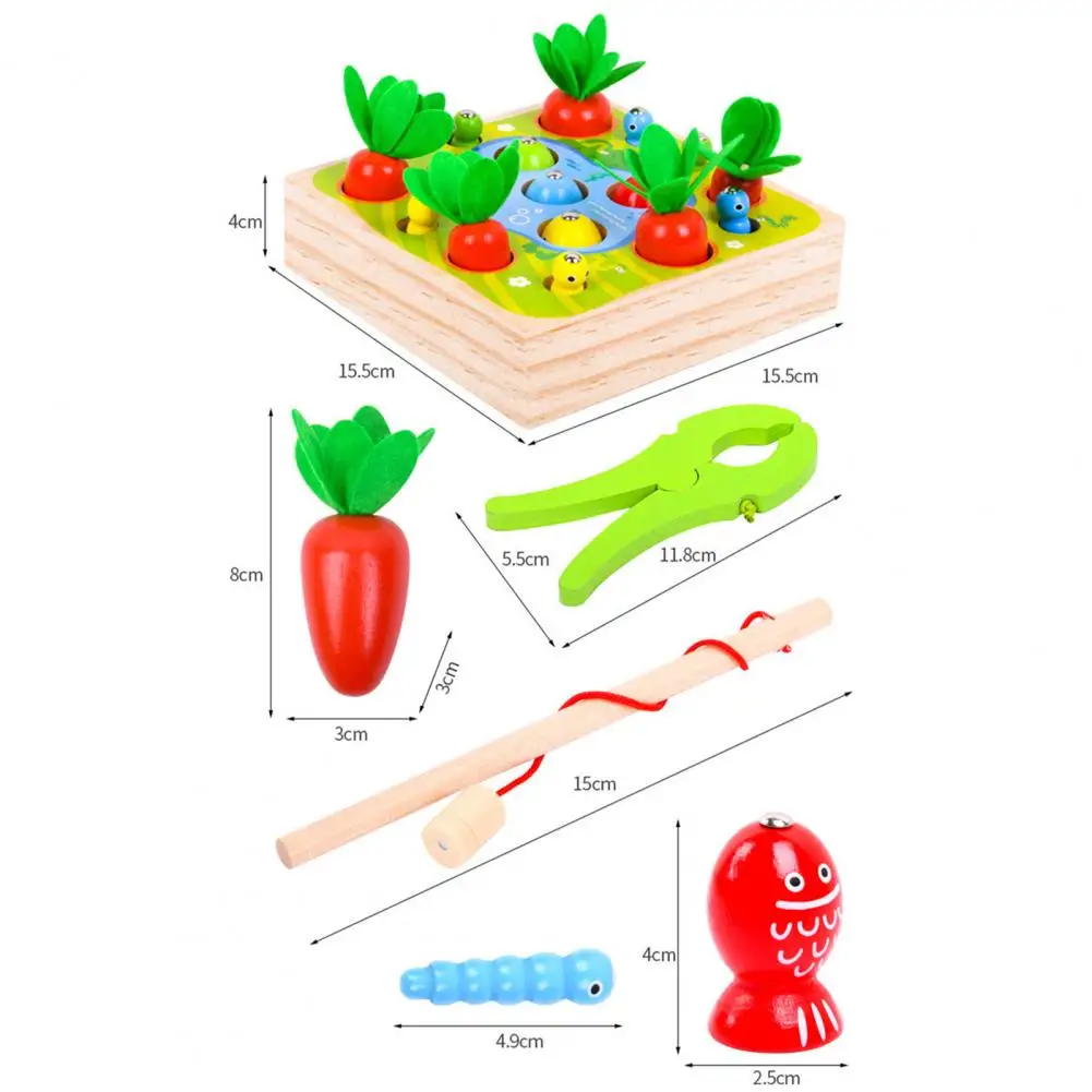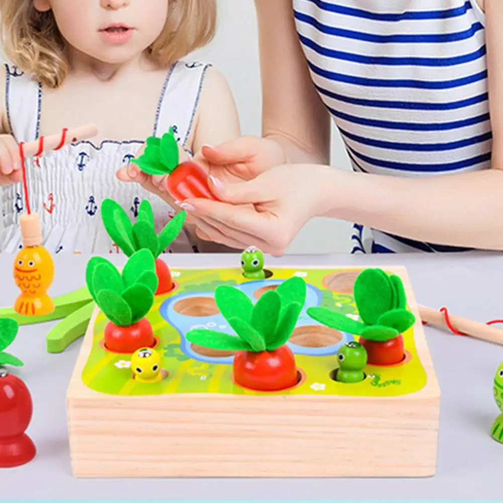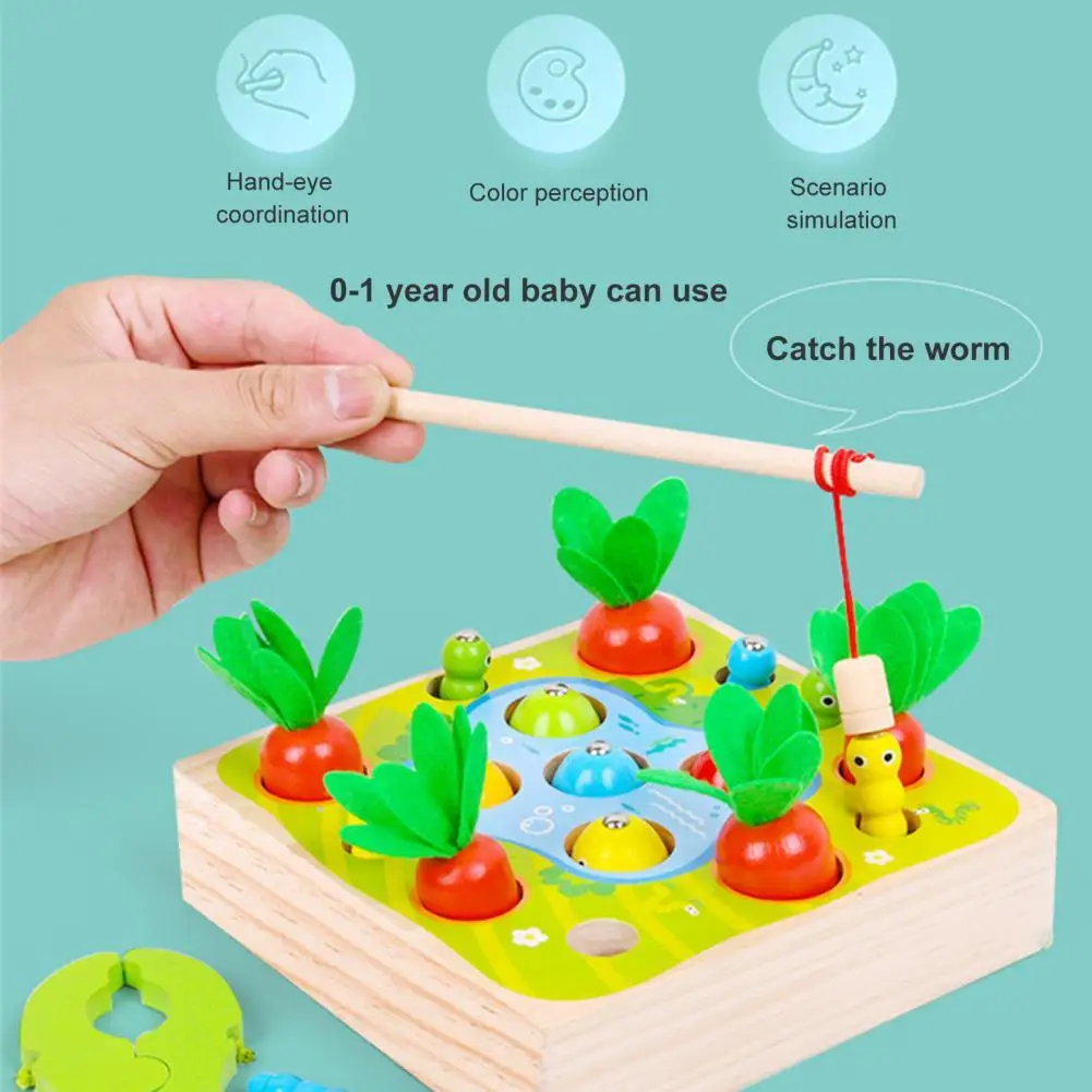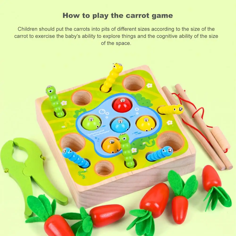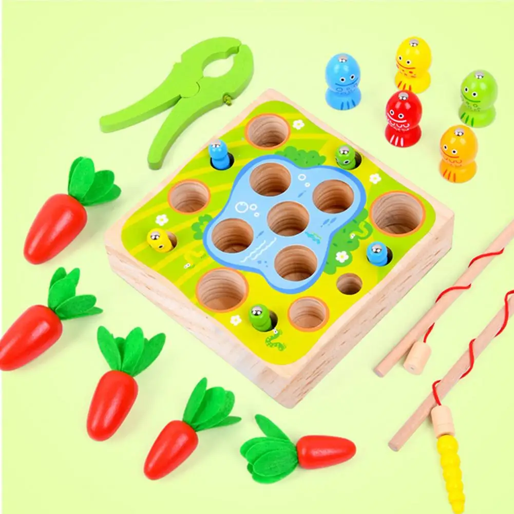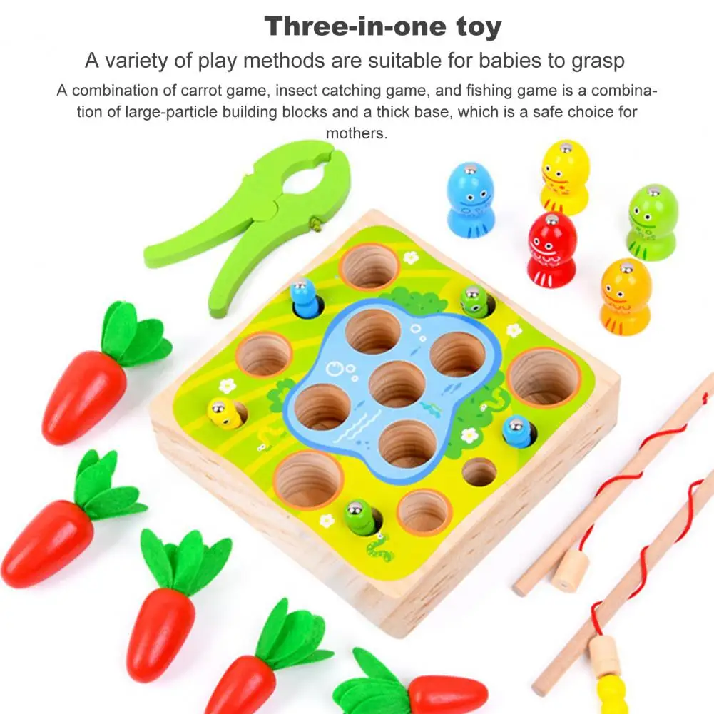 Это игрушка 3 в 1 с функциями вытягивания моркови, ловли червя и рыбалки, которая имеет толстое основание и большие блоки.