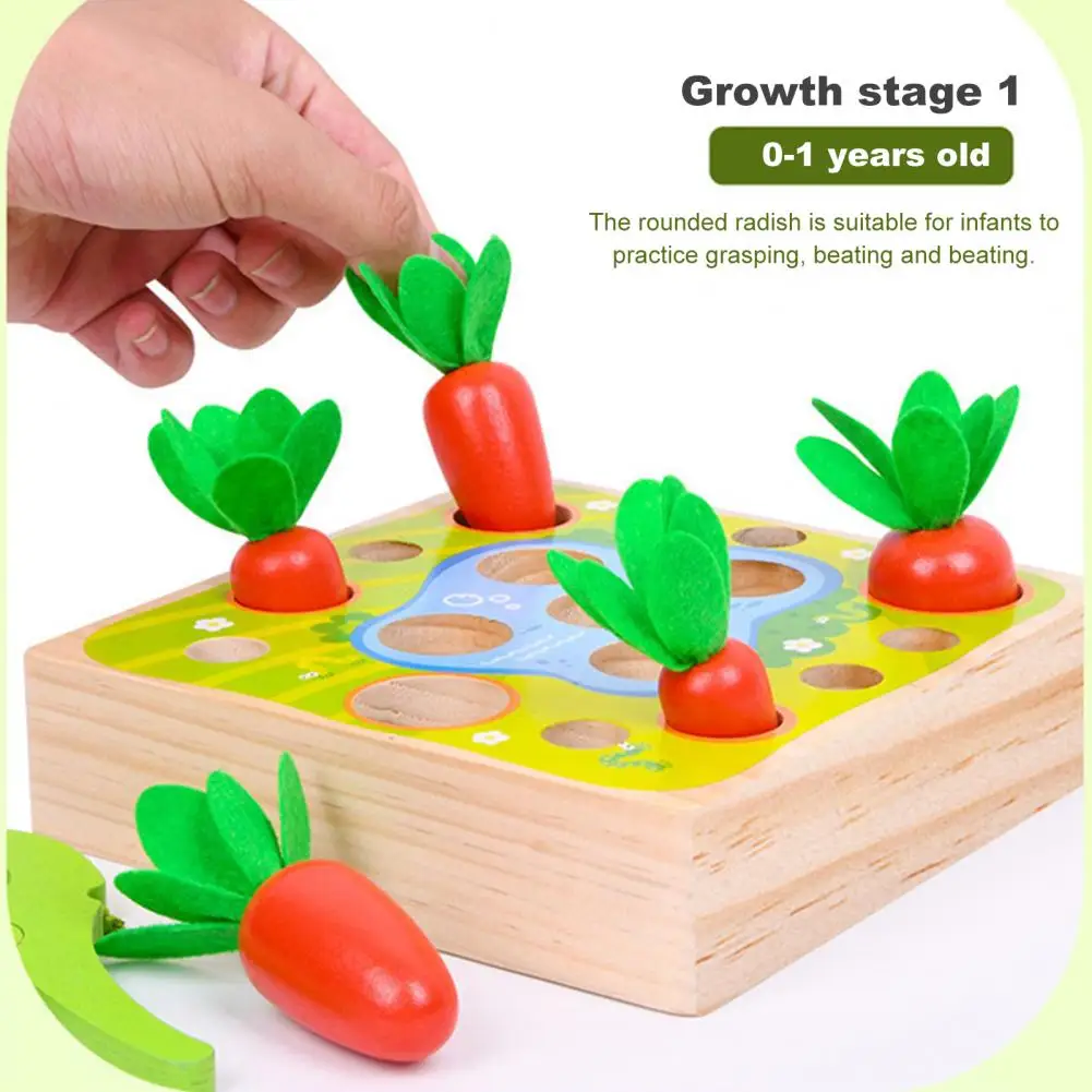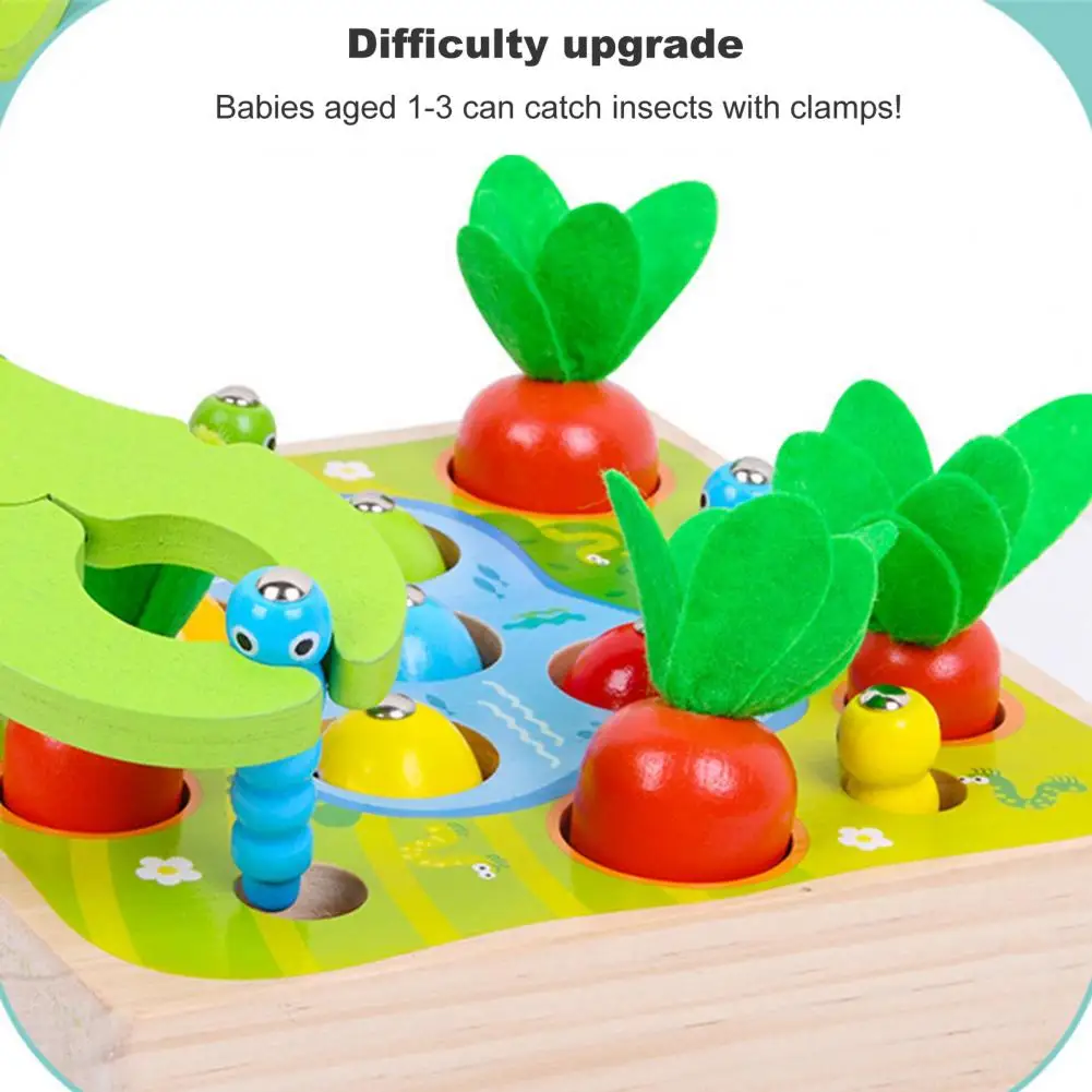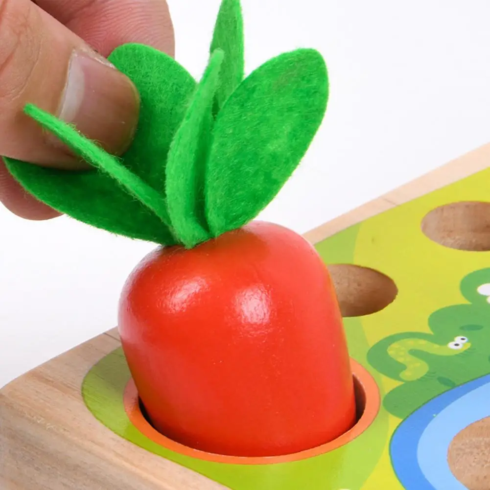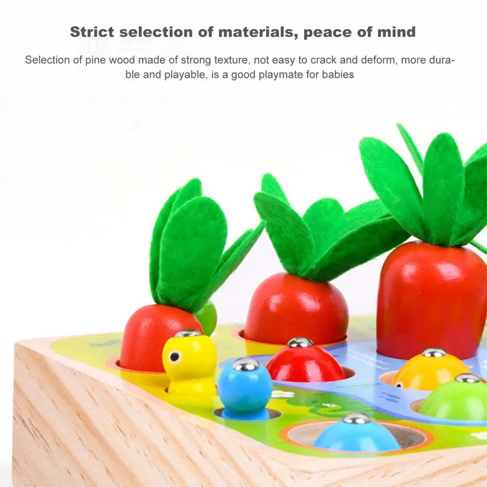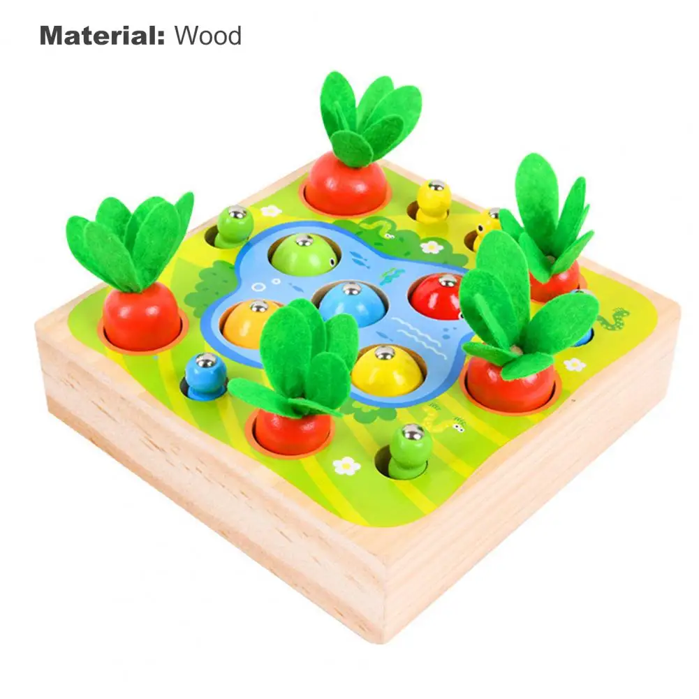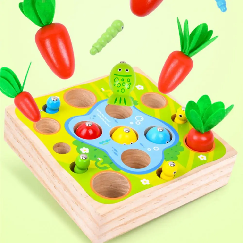 Это игрушка 3 в 1 с функциями вытягивания моркови, ловли червя и рыбалки, которая имеет толстое основание и большие блоки.